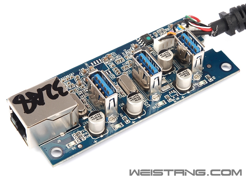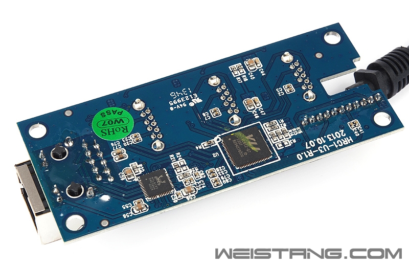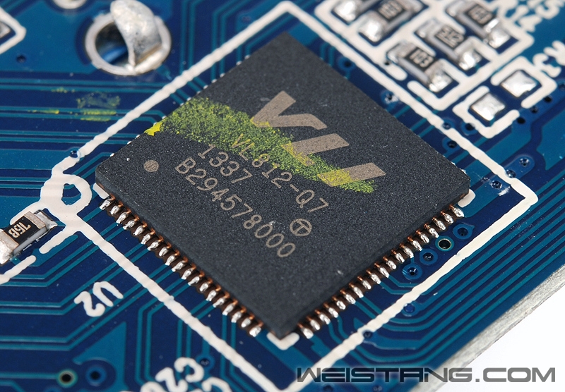 PCB正面密密麻麻各种MLC贴片元件,包括固件芯片以及对应每个USB 3.0接口的滤波稳压电容和输入滤波电感。 Orico HR01 PCB 正面 Orico HR01 PCB 正面 HR01背面整合了包括威盛VLI812 USB 3.0集线芯片和瑞昱RTL8153千兆网卡芯片。 Orico HR01 PCB 背面 威盛的VLI 812 USB 3.0集线控制芯片 VLI812具备下游带宽均衡技术,保证下游的USB 3.0设备拥有最好的传输性能,单颗VLI812支持USB 3.0四个通道。 瑞昱RTL8153千兆网卡芯片