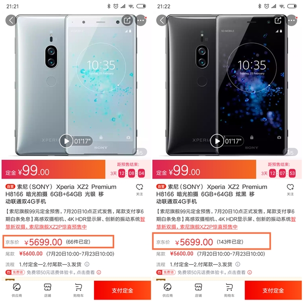 7月11日,索尼Xperia XZ2 Premium正式上架京东商城并开启预售,售价5699元。 截至7月16日晚上9:30,京东平台显示索尼Xperia XZ2 Premium炫黑版预订量只有143件,而光银版只有66件,总计209件。 该机最大的卖点是拍照,它后置1900万+1200万Motion Eye Dual双摄,搭载1/2.3 Exmor RS移动传感器,支持960帧超慢动作视频拍摄。 而且它支持感光度达12800的视频拍摄以及51200 ISO的照片拍摄,配合AUBE融合图像信号处理器的双传感器系统,达到最佳成像输出。 屏幕也是索尼Xperia XZ2 Premium的一大亮点,它采用了5.8英寸4K HDR显示屏,这是全球首款配备4K屏的骁龙845旗舰,搭载了X-Reality移动图像引擎、VRAVIA电视技术,显示效果细腻出彩。 核心配置上,索尼Xperia XZ2 Premium搭载高通骁龙845处理器,配备6GB内存+64GB存储,电池容量为3400mAh。 该机将于7月20日正式开售。 |