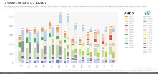 刚刚过去的7月份,AMD处理器的销量超过了Intel。 本次数据基于德国最大的电子产品零售商之一Mindfactory,虽然比例上还都算50%,但是从柱状图和官方口径来看,AMD的销售量级是略高于Intel的。 当然,在锐龙处理器发布后,AMD已经尝到过压制Intel的滋味。同样是Mindfactory的数字,去年8月、9月、10月、11月连续四个月,AMD处理器的总销量都盖过了彼时的Intel。 在AMD阵营中,最受消费者欢迎的是Ryne 5 1600,新品Ryzen 7 2700X和Ryzen 5 2600X的势头也不错,逐渐开始担纲主力。 Intel这边,卖相最好的依然是i7-8700K,接下来是i5-8600K和i5-8400。 越来越多的迹象表明,在2018自然年过后,AMD在全球桌面CPU市场上,将进一步从Intel身上蚕食份额。 |