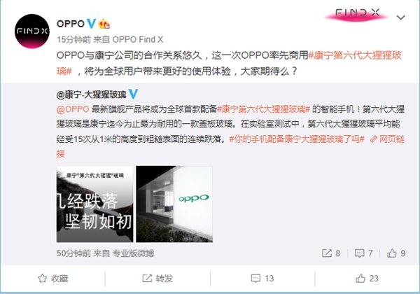 8月2日晚,康宁大猩猩玻璃官方微博预告,OPPO最新的旗舰产品将成为全球首款配备康宁第六代大猩猩玻璃的智能手机。 随后OPPO官方转发了这条微博,表示OPPO这一次率先商用康宁第六代大猩猩玻璃,将为全球用户带来更好的使用体验,大家期待吗? 遗憾的是,OPPO并未透露配备康宁第六代大猩猩玻璃的具体型号。考虑到OPPO旗舰Find X刚刚开售,推测OPPO新一代R系列手机R17有可能会率先使用第六代康宁大猩猩玻璃。 OPPO副总裁吴恒刚表示:“OPPO与康宁一直保持着紧密合作关系,我们已经通过多款OPPO智能手机产品为全球消费者带来出色的使用体验。我们非常激动能在OPPO即将发布的全新智能手机产品上率先商用康宁第六代大猩猩玻璃,我们相信全球消费者将获得前所未有的使用体验。” 康宁第六代大猩猩玻璃于2018年7月推出,这是康宁迄今为止最为耐用的一款盖板玻璃。官方介绍,在实验室测试中,第六代大猩猩玻璃平均能经受15次从1米高度到粗糙表面的跌落。在相同的测试条件下,其它竞品玻璃,例如钠钙和铝硅玻璃等,在首次跌落时就出现损坏。 |