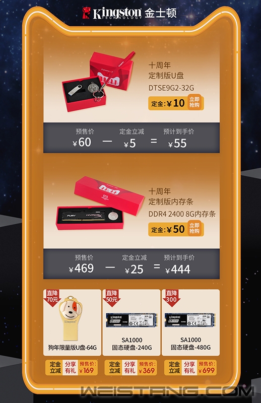 距离一年一度的双11越来越近了,不少小伙伴都开始摩拳擦掌,期待这个轻松欢快“占便宜”的节日,而2018年又适逢“天猫双11全球狂欢节”十周年,注定今年双11盛情难拒。此时,不少商家的预售活动已经开始,其中声势最为浩大就要属全球存储领袖——金士顿。 金士顿在10月20日正式开始双11的预售,提前拉开双11狂欢节的序幕,预售期间不仅会带来具有特殊纪念意义的“双11 天猫定制礼盒”,而且预售促销活动更是诚意满满,提前给大家送来了大礼,感恩“忆”路有你,精彩的购物狂欢节不容错过。 双11新玩法 分享双重有礼 今年双11有了一个新的玩法,那就是“分享有礼”活动,卖家将设置不同等级的任务机制,将优惠带给大家。其中,用户在商品详情页分享宝贝给好友后,收到分享的用户可以获得立减优惠券,而分享者也可领到商家的优惠券,将更多优惠不断传递下去。 今年双11期间,金士顿天猫官方旗舰店预售活动推出了“分享有礼”活动,只要您将宝贝分享给3名好友,收到分享的好友复制淘口令后打开手淘即可领取指定面额优惠券。3名好友全部领取成功后,您就可以获得指定面额的优惠券。数量有限,先到先得呦! 越早下单越实惠 定金立减0.5倍 在预售活动期间,参与预售的商品,均可享受“定金立减0.5倍”的促销活动,即付尾款时直接减掉定金的0.5倍。假设商品定金100元,那购买付尾款时可以享受到50元的价格优惠。剁手党,剁手党,就是看谁剁得快,赶紧来提前下定金,享受更多的现金优惠。 双十一定制纪念款 限量发售 从十年前“满足消费者需求,上天猫就够了”的品牌诉求,到如今的“理想生活上天猫”品牌理念转变。今年天猫双11全球狂欢节十周年,“理想好货”成为了众人追捧的焦点。此次,金士顿就联合天猫特别定制了“理想好货”。预售活动期间,金士顿推出的两款“双十一天猫定制礼盒”,分别是金士顿DTSE9G2 32G U盘与HyperX FURY DDR4内存定制礼盒。 金士顿DTSE9G2 32G U盘,月销量过万,采用轻便、时尚、耐用的全金属外壳,拥有精致的钥匙环和无盖式设计,外形小巧适合随身携带。USB3.0接口,可为用户带来高效的使用体验。这款双11定制款产品的容量为32GB,精美的天猫定制化礼盒内还有一枚具有特殊意义的双11纪念勋章。 提到内存,那HyperX FURY系列几乎无人不知无人不晓,这款产品凭借出色的性价比长期霸榜电商销量。主流2400-2666MHz频率,1.2V低电压,精选高品质内存颗粒,拥有出色的兼容性与稳定性,支持PnP自动超频技术,无需设置,即可实现理想频率。最关键是亲民售价,让这款内存迅速捕获广大用户的心。在定制礼盒里,除了HyperX FURY系列内存,同样有一枚天猫双11特殊纪念勋章。 明星爆品,提前纳入购物车 本次预售活动中,还有明星爆品参与,它们分别是:金士顿A1000固态硬盘、金士顿A400固态硬盘、金士顿狗年限量版U盘等 。 金士顿A400为2.5英寸SATA接口固态硬盘,共有120G、240G、480G三个容量版本参与预售,最高读写速度分别可达500MB/s、400MB/s,可快速启动系统,加载游戏场景以及文件传输,显著提升电脑的运行效率。 金士顿SA1000系列固态硬盘为标准的2280接口并支持NVMe规范,共有240GB、480GB两个容量版本参与预售。在4通道群联E8主控和3D NAND闪存的助力下,最高读写速度分别可达1500MB/秒和1000MB/秒,保证了其优异的反应速度和超低的延迟时间。 金士顿狗年限量版 U盘为USB 3.1高速接口,可为用户快速存取海量数据。外型设计十分讨巧,搭配红色金属包装盒相当喜气,具有传统文化概念。上方猛犬图案与脚掌肉垫使用硅胶材质,捏起来疗愈纾压。萌趣实用的它,适合用来赠礼。 “双11”购物狂欢日转眼即到。每年的“双11”如同电商界的奥斯卡,大腕云集,各显神通。2018的双11预售大战即将打响,一向先人一步的金士顿更是做足了功课,为大家准备了多重好礼,定制礼盒,明星爆款……无疑这是剁手“理想存储好货”的绝佳时机,错过你就要再等一年了,感兴趣就赶快猛击金士顿预售专场链接吧! 金士顿官方旗舰店: https://equity-vip.tmall.com/agent/mobile.htm?agentId=117866&_bind=true |