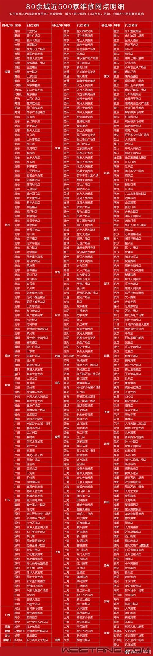 冬季来临,不少老手机开始出现自动关机、耗电快、充电慢的各种尴尬。 今日,苏宁手机官微宣布,苏宁快修推出了99元换iPhone、小米、华为电池活动,凡苏宁快修网点均可享受。活动时间为11月26日-12月13日。 与此同时,苏宁还统计了详细的门店名称地址,供大家参考。 据了解,苏宁快修提供的99元换电池服务均为第三方品质配件,可享180天质保,全国联保。 事实上,早在今年1月份苏宁就推出了该项活动,覆盖80余城近500家维修网点。 从此前媒体的实际换电池体验来看,整个过程较为便捷,另外有苏宁快修的技术保证,品质也让人放心。 以下为80余城500家维修网点明细: |