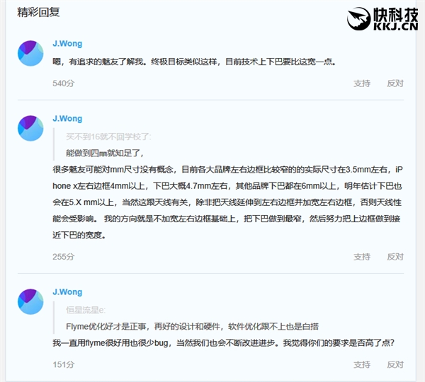 魅族掌门人黄章近日多次出面Diss“挖孔屏”设计,看来正打磨16s的他断然不会考虑这样的外形语言。 12月9日晚,在官方社区和“煤油”互动时,黄章饶有兴致地回复了一位网友(@KiritoTokyo)自制的“魅族16S想象图”。 该图的正面外形基本沿用了当前16th的理念,不过,上下边框进一步收窄且做到了等宽。在极限窄的“额头”位置,还藏下了长条形听筒、前置摄像头等组件。 黄章看完颇高兴,写道“嗯,有追求的魅友了解我。终极目标类似这样,目前技术上下巴要比这宽一点。” 当有网友指出“能做到4mm就知足了”时,黄章回复表示,“很多魅友可能对mm尺寸没有概念,目前各大品牌左右边框比较窄的的实际尺寸在3.5mm左右,iPhone X左右边框4mm以上,下巴大概4.7mm左右,其他品牌下巴都在6mm以上。” 他进一步透露,“明年估计下巴也会在5.X mm以上,当然这跟天线有关,除非把天线延伸到左右边框并加宽左右边框,否则天线性能会受影响。 我的方向就是不加宽左右边框基础上,把下巴做到最窄,然后努力把上边框做到接近下巴的宽度。 ” 根据黄章已经公布的信息,魅族16s系列将是第一波骁龙855机型,售价比当前这一代有所提高。 |