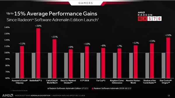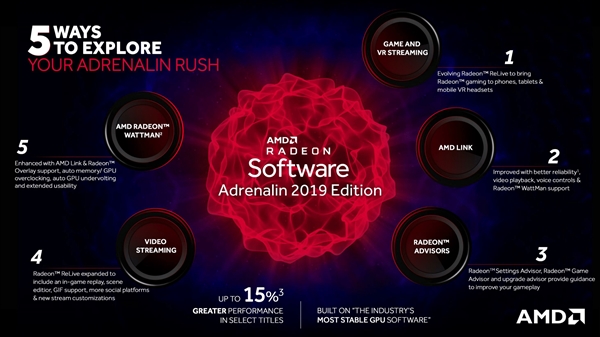今天(12月14日)凌晨,AMD正式上线年度“鸡血”驱动,Radeon Software Adrenalin 2019 Edition(2019年版肾上腺素),驱动软件版本号18.12.2,为WHQL正式版。 驱动支持AMD HD7000及以上显卡、包括对应集显的APU,下载在此。 首先大家最关心的性能方面,以RX 570为例,平均游戏性能相较去年的17.12.1版本,提升了15%,《战地5》更是提升35%之多。还有针对电竞项目的Project ReSX计划,着力优化《DOTA2》《堡垒之夜》《绝地求生》等,提升流畅度、降低延迟。 其次,说说核心特性,官方总结为以下几个方面: 一、Radeon Advisors - Game Advisor(游戏建议):联合Radeon Overlay功能,针对不同游戏提供相应的优化设置,带来个性化的、更好的体验,也就是更高的帧率、更低的延迟。 - Settings Advisors(设置建议):针对从未使用过A卡驱动设置的新手,根据当前配置情况,推荐不同功能应该开启还是关闭。 - Upgrade Advisor(升级建议):自动分析最低和推荐游戏兼容性,确定是否升级新版游戏/驱动。 二、Radeon Wattman - 核心/显存自动超频 - 核心自动降压 - 温度相关风扇曲线 - RX Vega显卡解锁DPM(动态电源管理)状态 - 显存调校 三、显示 - FreeSync 2 HDR:改进自动调校映射,画面细节更逼真 - VSR超级分辨率:支持21:9超宽屏 四、Radeon Overlay - 显示设置:游戏内可调整增强同步、FreeSync、逐个游戏设置 - Wattman:游戏内可调整核心频率、核心电压、核心温度、显存时序、显存频率、载入/保存进度 - 性能指示器:帧率和帧延迟时间,可调整颜色、行列、位置、大小、透明度 五、AMD Link - 二维码链接 - 语音控制:直播、录制、截图、实时回放、最低/平均/最高帧率、核心温度、核心频率、显存频率、风扇转速 - Wattman:设置和Radeon Overlay内相同 - 性能指示器增强:详尽性能分析,把手机变成跑分工具 - ReLive:在手机上查看、编辑、直播视频/截图 六、AMD ReLive - 游戏内回放 - 场景编辑器 - 支持GIF动画 七、AMD ReLive直播 - 无线传输至移动设备,最高4K60FPS - Android、iOS都支持且免费 - 延迟时间70ms,低于竞品的125ms - 支持与AMD Link互动 - VR:支持HTC Vive Focus、Oculus GO、三星Gear VR、Google Daydream,兼容第三方蓝牙设备,最高1440×1440p |