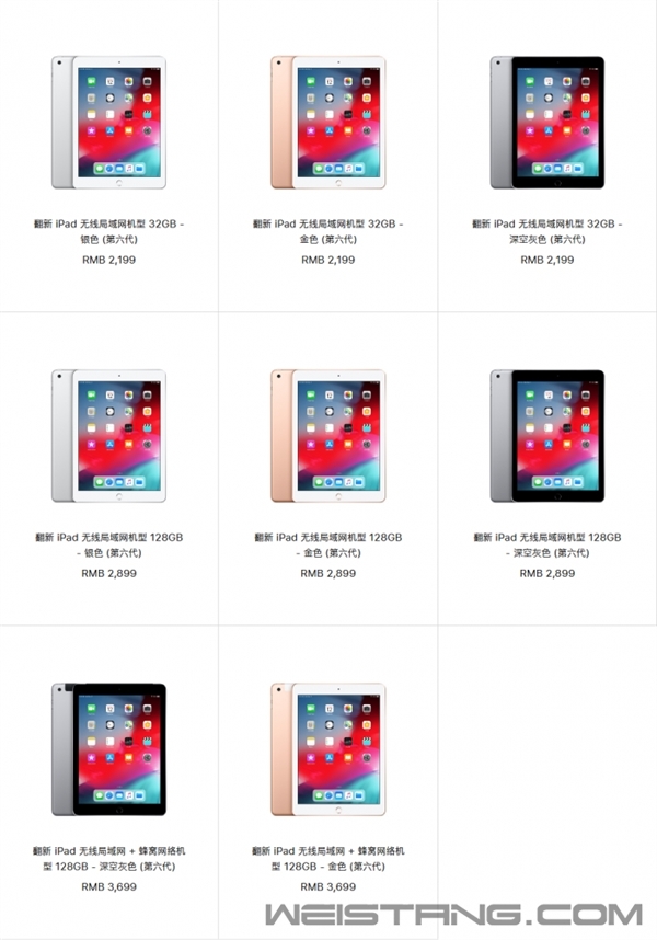 如果你想购买便宜的iPad,那么机会来了,苹果已经在中国上线了第六代翻新版iPad了。 现在,苹果中国官网已经上架销售了第六代iPad的官翻版本,其中WiFi机型有32GB和128GB两个版本,金色、银色和灰色供选择,而WiFi+蜂窝网络版本只有128GB版本可选,颜色上也去掉了银色。 售价上,WiFi机型是2199元起,对应的32GB版本,而128GB版本售价为2899元,同样没有银色,至于WiFi+蜂窝网络的128GB版本,其官翻售价为3699元,同时以上所有官翻机型均支持12期免息。 作为2018年3月份发布的产品,第六代iPad配备了9.7 英寸视网膜显示屏,具备800万像素摄像头和正面FaceTime高清摄像头,支持1080p 高清视频拍摄,搭载A10 Fusion处理器,提供10小时电池使用时间,机身重量为478 克,厚度为7.5 毫米。 |