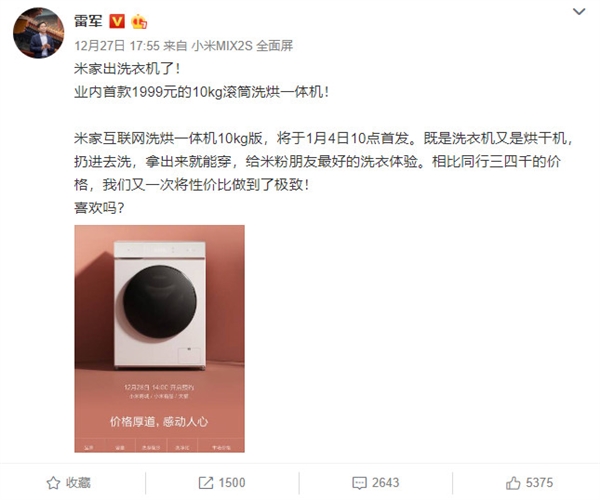 12月27日,小米发布了米家互联网洗烘一体机10kg版,正式宣告进军洗衣机行业。同时第一次将此类产品做到2000元之内,而市售产品基本都在3000元以上,颠覆又一个千亿级市场的节奏。 昨晚,雷军在微博上力挺米家互联网洗烘一体机,他表示,相比同行三四千的价格,我们又一次将性价比做到了极致。 雷军发微博称:“米家出洗衣机了!业内首款1999元的10kg滚筒洗烘一体机!米家互联网洗烘一体机10kg版,将于1月4日10点首发。既是洗衣机又是烘干机,扔进去洗,拿出来就能穿,给米粉朋友最好的洗衣体验。相比同行三四千的价格,我们又一次将性价比做到了极致!喜欢吗? ” 据了解,米家互联网洗烘一体机支持10kg洗涤、6kg烘干,在洗净比、漂洗率、烘干除菌率等关键指标均达到了A+标准,1.11的洗净比更是超过了新国标的1.10。 核心部件上,米家互联网洗烘一体机搭载BLDC变频电机,最高脱水转速达1400转/分钟,支持1小时快速洗烘。 水冷凝式热风烘干技术可一次烘干多件衣物,恒温控制可让烘干的衣服饱满松软而无需熨烫,95摄氏度高温筒自洁模式除菌率高达99.9%+。同时支持智能空气洗等多达21种洗涤模式,还可以直接洗羽绒服。 据悉,米家互联网洗烘一体机10kg版售价2499元,首发尝鲜价1999元。12月28日下午2点在小米商城、小米有品、天猫开启预约,1月4日上午10点正式开售。 |
