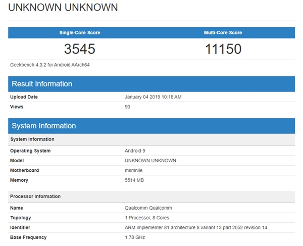 日前网上曾曝出一份索尼新旗舰Xperia XZ4的安兔兔跑分,接近40万,对比骁龙845提高了超过10%,基本确定是来自骁龙855。 现在,GeekBench数据库里又出现了一份疑似骁龙855的成绩,设备显示为“UNKNOWN UNKNOWN”(未知),处理器型号只有一个疑似代号“msmnile”——msm代表骁龙处理器,nile(尼罗河)则或许是骁龙855的开发代号。 频率检测为1.78GHz,也正好对应骁龙855四个能效小核心的1.80GHz(一个超级核心2.84GHz、三个性能核心2.42GHz)。 成绩显示为单核心3545、多核心11150,对比骁龙845的最好表现分别提升约35%、22%,而对比一般的骁龙845成绩则能高出大约45%、25%——前者正好符合高通官方宣称的45%提升,也是骁龙历史上最大的提升幅度。 不过对比先发的华为麒麟980,骁龙855的优势并不明显,单核心只能领先5%左右,多核心也就10%左右的样子,最多不过15%(麒麟980性能模式下多核心跑分提升明显)。 其实这倒也在意料之中。骁龙855 CPU架构虽然是自主的Kryo 485,但普遍认为就是在ARM A76公版架构基础上魔改而来,麒麟980虽然没有单独的CPU代号,但也明确强调是基于A76的商用,显然也做了魔改,再加上二者最高频率相差无几(2.84GHz VS. 2.60GHz),很难拉开差距,骁龙855的领先似乎更多来自略高的频率。 |