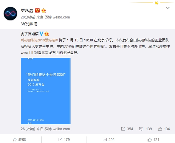 2018锤子流年不利,近期更是负面消息不断,接连曝出被冻结存款。罗永浩在微博上也基本处于“缄默”状态,从11月下旬开始仅转发微博,不再公开发声。而好消息是,一周之后的的1月15日,老罗终于又要公开露面了。 今日,子弹短信官方团队,快如科技2019发布会将于1月15日19:30在北京举行。 “本次发布会由快如科技的创业团队及投资人罗先生主讲,主题为'我们想跟这个世界聊聊'。发布会门票不对外出售,届时欢迎前往 www.t.tt 观看此次发布会的全程直播。 ”快如科技官微称。 罗永浩也在个人微博进行了转发,但没有附带任何评论,一如既往三缄其口。 事实上, 早在去年10月30日,罗永浩就曾在透露,子弹短信上线后最大的更新,将在元旦前后专门召开一场隆重的发布会。 这也是自11月16日锤子地平线旅行箱发布之后,罗永浩再次登发布会主讲。只是这一切,都再与锤子无关。 锤子接下来的走向以及结局,尚未有定数,接下来还会不会有锤子手机,目前还是个问号。 |