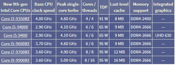 9代酷睿桌面处理器今天(1月8日)正式扩军,新增6款产品,本月起陆续上市。 经官网确认(发稿前已被撤下),新增的6款处理器分别是i5-9400(带核显UHD620),还有5款后缀F不带核显的芯片,包括Core i3-9350KF、Core i5-9400F、Core i5-9600KF、Core i7-9700KF和Core i9-9900KF。 其中,i3-9350KF设计为四核四线程,主频4.0GHz,可睿频到4.6GHz,三缓8MB,支持DDR4-2400内存,功耗91W。 其它无核显芯片的频率等参数与原版一致,同时不带K的两款新i5功耗也减少到65W。 当然,深挖发现,“F”芯片同时砍掉了对TSX-NI扩展指令集的支持。 暂不清楚Intel会主力通过零售还是OEM渠道(定制整机)的形式来销售“F”芯片,但显然,砍掉核显后其价格应该会有所下降,对于那些中高端独显平台用户可以减少DIY成本。同时,对于AMD锐龙CPU来说,Intel此举无疑也进一步增强了己方产品的竞争力。 |