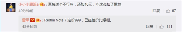1月15日消息,小米科技创始人兼CEO雷军微博提醒:红米Note 7支持QC 4快充,在小米商城购买红米Note 7,加10元即可入手18W快充(零售价29.9元)。 对此有网友表示:“直接送个不行嘛,还加10元,咋这么抠了雷总”。雷军表示,红米Note 7定价999元已经性价比爆棚了。 该机采用6.3英寸2340×1080显示屏,搭载满血版高通骁龙660处理器,前置1300万像素摄像头,后置4800万+500万AI双摄,电池容量为4000mAh。 不仅如此,红米Note 7采用了康宁第五代大猩猩玻璃,雷军称红米Note 7使用的康宁第五代大猩猩玻璃是很多友商两三千元旗舰都舍不得用的产品。 更重要的是,红米Note 7使用与小米旗舰手机相同质量标准,官方承诺提供18个月超长质保。 目前该机已经在各大平台开售,3GB+32GB版售价999元,4GB+64GB版售价1199元,6GB+64GB版售价1399元。 |