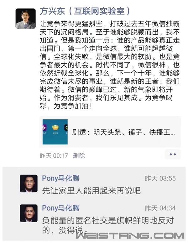 1月15日,快播创始人王欣推出的马桶MT、字节跳动旗下的多闪、锤子科技投资的聊天宝三款社交产品在同一天正式发布。 遗憾的是,上述三款App在上线当天无一例外遭到了微信封杀。锤子科技CEO罗永浩表示,被封杀是商业大环境问题,反垄断法和不正当竞争法还不够完善。 互联网实验室CEO、中国博客教父方兴东在朋友圈评论:让竞争来得更猛烈些,打破过去五年微信独霸天下的沉闷格局。至于谁能够脱颖而出,我不知道。 但是我知道一点:谁的产品能够真正走出国门,第一个走向全球,谁就可能超越微信。全球化失败是微信最大的软肋,也是竞争者最大的机会。时代不统了,微信很神也依然折戟全球化。那么下一个十年谁能够完成微信未尽的事业,谁就是新的王者。 我们期待着,微信的巅峰已过,新的气象即将开始。作为消费者我们乐见其成,为竞争者喝彩,为竞争加油。 腾讯公司主要创办人、腾讯公司董事会主席兼首席执行官马化腾回应:先让家里人用起来再说吧,负能量的匿名社交是旗帜鲜明地反对的,没得说。 |
