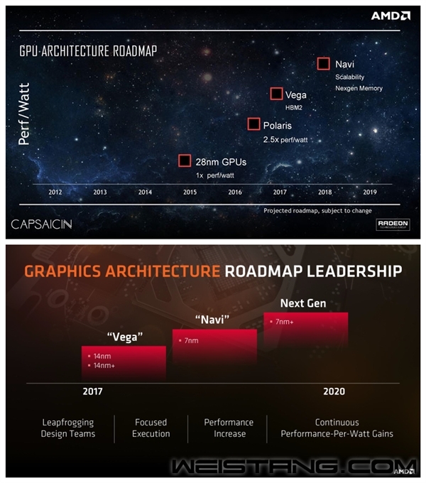 虽然不少爆料都准确前瞻了AMD会在CES上发布7nm Ryzen 3000处理器,但是Radeon VII的出现的确是个意外之喜。 从AMD此前的路线图来看,Vega并未做明确的7nm规划,可能是因为AMD也觉得欠玩家一张能与NVIDIA RTX系列抗衡的产品,所以只好亮剑。 来自外媒的最新爆料称,AMD有望在今年的E3(6月11到13日)上发布新一代Navi(仙后座)GPU图形产品。 AMD显卡先后两张路线图 不过,需要注意的一个细节是,Navi的定位是入门到中端主流,也就是和当年的Polaris北极星类似,可能最高RTX 2060级别。当然,Navi是否支持DXR光线追踪还不得而知,传言NVIDIA也在打造RTX 2060“非光追”版,名为GTX 1660 Ti,看来,真正的甜点卡之争会相当精彩。 另外顺带一提,AMD讳莫如深的“Nex Gen”GPU,也就是Navi后的下一代,据说代号“Arcturus(大角星)”,升级7nm+工艺,能效显著提升。 |