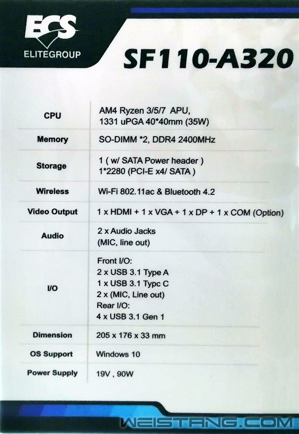 一直以来,AMD Ryzen锐龙在迷你机市场上一直缺乏存在感,产品极少,尤其是鲜有大厂产品。近日,精英(ECS)展示了一款采用锐龙APU的迷你机“SF110-A320”,相信未来会看到越来越多的锐龙迷你机。 精英SF110-A320的体积只有205×176×33毫米,也就是不到1.2升,采用了热设计功耗只有35W的锐龙3/5 APU,自带Radeon Vega图形核心,搭配A320芯片组——不过精英在规格表里写了锐龙7 APU,显然是个笔误。 微星还提供了两条DDR4-2400 SO-DIMM内存插槽、一个M.2 2280 SSD插槽(PCI-E/SATA),支持802.11ac Wi-Fi、蓝牙4.2,而电源功率仅仅90W。 输入输出接口也非常丰富,一个VGA、一个HDMI、一个DisplayPort、一个COM串口(可选)、两个3.5mm音频口、六个USB 3.1 Type-A、一个USB 3.1 Type-C。 不过遗憾的是,该机并没有扩展硬盘位,也没有有线网卡。 上市时间和价格暂时未定。 |