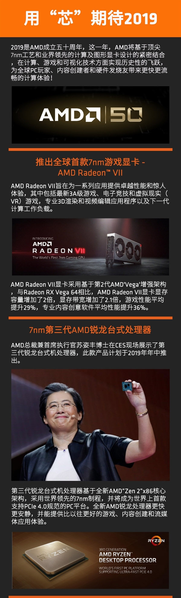 2019将是AMD公司成立五十周年,今天上午(1月21日),AMD中国宣布,今年将基于顶尖的7nm工艺和业界领先的计算及图形显卡设计的紧密结合,在计算、游戏和可视化技术方面实现历史性的飞跃。 AMD承诺,为全球PC玩家、内容创建者和游戏发烧友带来更快更流畅的计算体验。 事实上,在刚刚落幕的CES 2019上,AMD就带来了多款重磅产品,包括全球首款7nm游戏显卡Radeon VII(Radeon 7),性能对标RTX 2080,2月7日发售。 同时,7nm工艺也覆盖到了桌面锐龙平台, 第三代Ryzen台式机处理器升级为Zen 2架构,且支持PCIe 4.0规范,年中上市。按照现场演示,可能是一款8C16T的锐龙5 3000系列产品的多核(Cinebench)居然就可以反超Intel i9-9900K。 另外,AMD 7nm霄龙“Rome”、12nm Zen+的锐龙3000笔记本处理器也悉数登场。 处理器方面,AMD战略比较明确,唯一缺憾是7nm APU可能需要多等待一段时间。显卡方面,除了Radeon VII,AMD CTO在本月的一次采访中也预告,今年会有更多显卡产品登场,Navi可以期待下了。 |