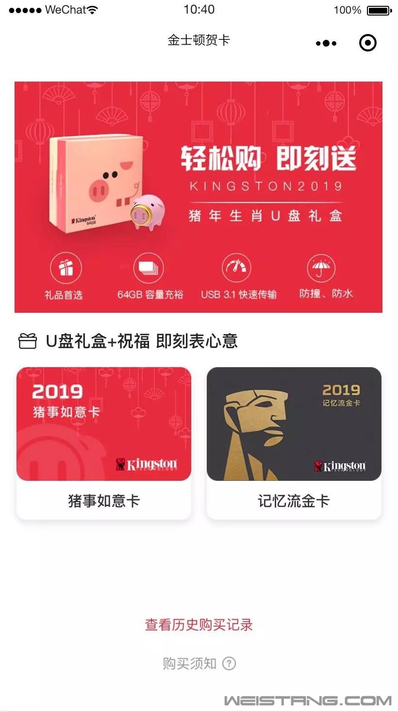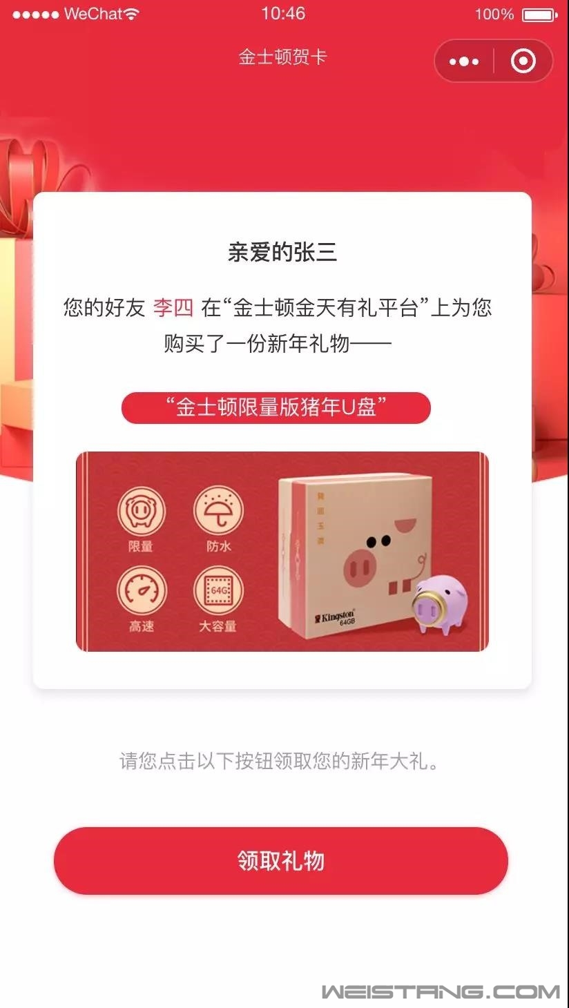 辞旧迎新之际,亲朋好友送礼少不了利是红包、瓜果蔬菜,其实,这些都是“浮云”,红包花完了就没了;瓜果蔬菜吃完了,也没了。送礼一定要送心意,让亲朋好友未来一整年都惦念着你,什么礼物能有如此魅力?金士顿猪年生肖U盘礼盒吧!而且现在送礼更简单,动动手搜索小程序“金士顿金天有礼”就好了,简直比“把大象放进冰箱里”更简单! 金士顿金天有礼 限量版U盘礼盒 毫无疑问,金士顿猪年生肖U盘礼盒是当下最好的送礼佳选。整体造型选择2019年生肖金猪,主材质选用了粉色主色调的橡胶,防撞又防水,猪鼻子用了中国人最喜欢的黄金色,还有大气的礼盒包装,简直就是送礼的不二之选。 并且,出色的不仅仅只有外观,内在规格更是彪悍。首先,采用64GB大容量,对于一个U盘而言,平时存储数据已经相当富余。对于720P电影,如果1GB一部,可以存储60部;如果是无损音乐,30MB一首,可以存储2000余首;如果是高清照片,5M一张,更是可以存储超过上万张,所以日常使用绰绰有余。其次,USB3.1接口,理论上传输速度可以超过1GB,是USB3.0速度的2倍以上,是常见的USB2.0速度的30倍!拷贝一部720P的电影,如果USB2.0需要30秒,那么USB3.1可能只需要让人咋舌的1秒! 走心小程序 送礼超简单 这么好的送礼佳品,难道不应该匹配一个更走心的送礼形式吗?当然要!现在搜索小程序“金士顿金天有礼”购买方便简单,送礼更有心,更新颖。 打开小程序,选择要送的礼物“猪年如意卡”或者“记忆流金卡”,写上要送的人姓名,祝福语,以及自己的名字,付费即可。 至于怎么送,其实更简单,把新年祝福通过微信转发给你要送的亲朋好友就好了,就是这么简单。是不是感觉比一个红包更有心意,也更温暖走心? 收到礼物的朋友,可以先看最美好的祝福,然后填写自己的姓名、电话、地址,剩下就是等快递将礼物送到府上,开启一整年的好运气、好心情! 现在购买“金士顿限量版猪年U盘“的朋友还要特别留心一件事,现在起至下次微信推送前,使用金士顿金天有礼并在文章(https://mp.weixin.qq.com/s/NDe4sAeb4SjnpNM15J7YZA)下留言分享祝福语与订单号的朋友,报名者中抽取20名最佳创意祝福提供免单福利。你送礼,金士顿买单,是不是更有心意?还等什么,手指动起来! 更多详情请点击金士顿官网: https://www.kingston.com/cn 金士顿限量版猪年生肖U盘小程序购买搜索:金士顿金天有礼 |