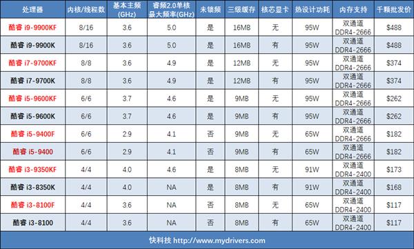 Intel日前推出了一批无核心显卡的新酷睿处理器,包括i9-9900KF、i7-9700KF、i5-9600KF、i5-9400F、i3-9350KF、i3-8100F等六款型号,除了屏蔽核显之外规格与标准版毫无二致,官方批发价也完全相同。 其中,i5-9400F已经在国内开卖,要价1499元,对比有核显、速度慢100MHz的上代i5-8400反而还便宜了50元,还算良心。 现在,美国大型零售商B&H Photo and Video已经率先开始预售顶级型号i9-9900KF,不过可能是抢先加唯一的缘故,价格有点离谱,达到了582.5美元(约合人民币3910元)。 相比之下,i9-9900KF的官方批发价为488美元,i9-9900K目前在美国市场售价为530美元左右。 换言之,这个预售价比官方价贵了足足75%(虽然Intel一再强调批发价不等于零售价),比市售i9-9900K也贵了大约10%。 希望最终零售上架的时候别这样。 i9-9900KF采用14nm++工艺制造,8核心16线程,核心频率3.6-5.0GHz,i9-9900K之后第二款可加速至5GHz的量产型号,配备16MB三级缓存,支持双通道DDR4-2666内存,热设计功耗95W。 |