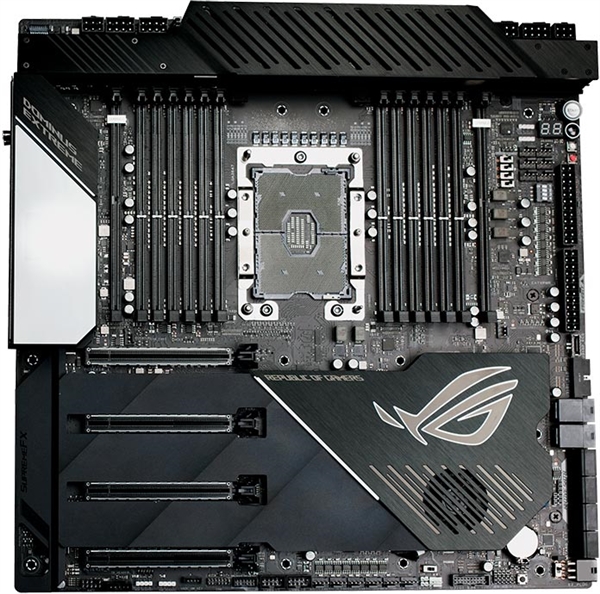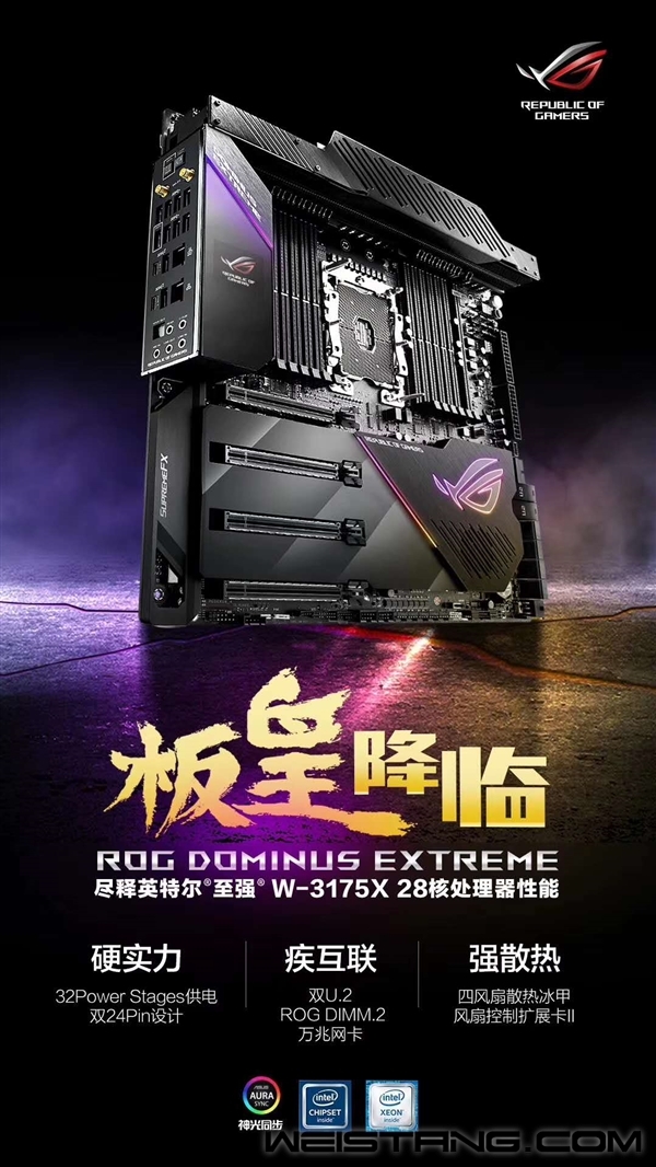 Intel正式发布了28核心56线程的Xeon W-3175X处理器,其特殊之处一是接口和桌面上的LGA1151、LGA2066截然不同,是来自服务器的LGA3647,搭配芯片组也是服务器上的C621,另外热设计功耗达到了惊人的255W,这都对主板提出了极高的要求。 迄今为止,支持W-3175X的主板只有两款,分别来自华硕、技嘉。现在,华硕的ROG Donimus Extreme正式发布了! 该主板采用了14×14英寸(35.56×35.56厘米)的超大尺寸EEB/ATX板型,供电电路、芯片组、PCIe插槽等区域覆盖全铝散热片,整体多达四个风扇,背部也有辅助背板。 为了满足变态的供电需求,华硕设计了32相供电电路,两组24针主接口,可同时连接两个电源,另有四个8针、两个6针辅助接口。 自带1.77英寸LiveDash OLED屏幕,可显示多种系统参数信息,当然也少不了神光同步。 庞大的LGA3647插座两侧是12条内存插槽,支持六通道,最大容量192GB,最高频率4200MHz,并支持ECC。 扩展插槽是四条PCIe 3.0 x16,可以支持三路x16/x16/x16或者四路x16/x8/x16/x8,四路SLI、CrossFireX都没问题。 存储有芯片组的六个SATA 6Gbps,祥硕主控的两个SATA 6Gbps,处理器的两个U.2、两个ROG DIMM.2模组,后者分布在内存插槽两侧,可安装四块M.2 SSD,均支持PCIe 3.0 x4模式。 网络方面有Aquantia AQC-107万兆网卡、Intel I219千兆网卡、Intel Wireless-AC 9260 802.11ac无线网卡(双频/MU-MIMO/最大速率1.73Gbps),并支持蓝牙5.0。 ROG SupremeFX声卡基于Realtek S1220八声道解码器,信噪比输出120dB、输入113dB,拥有ESS SABRE9018Q2C DAC/AMP,五个LED发光音频口和S/PDIF。 USB接口极大丰富,包括芯片组的后置八个USB 3.0(蓝色)、插针四个USB 2.0,三颗祥硕主控的前置一个USB 3.1、后置四个USB 3.1(两个红色Type-A和两个红色Type-C)、插针四个USB 3.0。 技嘉的C621主板:28相供电、12条内存插槽、七条PCIe x16插槽 |