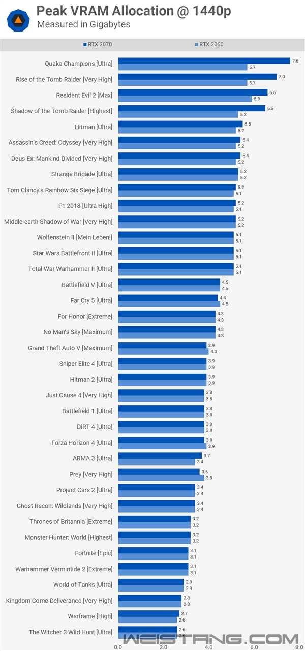 RTX 2060虽然把甜点卡的价格拉高到了3000元左右,但综合来说这仍然是一款相当优秀的产品,甚至能在1080p分辨率下搞定光追游戏。 不过,RTX 2060搭配的显存只有6GB GDDR6,如果用它玩2560×1440 2K分辨率的游戏,而且开到高画质,够用吗?TechSpot最近就此做了一次专门的测试。 开始测试之前说明一点,一款游戏占用了多少显存,并不一定代表非得需要这么多,比如《生化危机2》,RTX 2080 Ti 4K分辨率下能被吃掉8.5GB,但如果使用6GB显存,其实也没多大影响,只有少于6GB的时候才会出现明显损失,这类游戏的原则就是显存能吃多少就尽量多吃。 测试一共跑了多达37款游戏,都开到了最高画质,并开启一定级别的抗锯齿。先来对比RTX 2060 6GB、RTX 2070 8GB: 《雷神之锤:冠军》(Quake Champions)这款游戏国内玩得不多,但这次测试中却脱颖而出,RTX 2060被吃掉了5.7GB显存,RTX 2070则是吃掉7.6GB,但它就像刚才说的《生化危机2》,属于比较贪婪的那种,其实4GB显存一般就能喂饱它。 《古墓丽影崛起》、《生化危机2》、《古墓丽影暗影》三款游戏在RTX 2060/2070上的显存占用量也差很多,最多都能占用6.5GB,除此之外其他游戏即便在RTX 2070上显存占用也不到6GB。 看样子,除了极个别情况,RTX 2060 6GB足以保证游戏在2K分辨率下流畅运行而不会爆掉显存。 还没完。我们知道,图灵架构改进了显存压缩,同样是6GB显存的话利用率会高于GTX 1060 6GB之类的老卡,所以接下来加入GTX 1060 6GB,看看同样的显存容量下两代产品有何差异。 《极限竞速4》等极少数游戏在GTX 1060上的显存占用比RTX 2060上多了500MB左右,但绝大多数只差100-200MB,看这样子新架构的显存压缩技术还是有用的,但一般不会造成实质性影响。 TechSpot还试图从2K、4K分辨率下RTX 2070/60的不同性能,来考察6GB、8GB显存的影响,但由于两款显卡本身规格和性能就差很多,这种比较其实很难得出什么确切结论。 按照他们的看法,虽然提高到4K分辨率后,性能差距会有所拉大,但更多是显卡本身性能、系统瓶颈之间的干扰,而且实际体验其实也差不太多。 综合来说,6GB显存对于2K分辨率下玩游戏目前是足够的,实在紧张稍微降低画质、抗锯齿级别就足以绰绰有余了,即便考虑到未来两三年游戏的发展也不会太紧张。 当然,如果你想彻底不用担心显存问题,甚至会在4K分辨率下玩游戏,8GB显存才是你的菜。 至于4GB显存,如今就别想玩高端游戏了,只有4GB HBM2显存的Fury X就一直是个反面典型: |