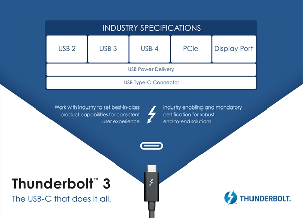 Intel官方宣布,将面向USB推广组织(USB Promoter Group)开放雷电(Thunderbolt)协议规范,厂商可以免费打造兼容雷电标准的芯片和设备。 同时,USB推广组织首次公布了即将发布的基于雷电协议的USB 4标准,实现底层雷电、USB协议的融合,增强基于USB Type-C接口的产品之间的兼容性。 事实上,现有的USB Type-C已经在一定程度上与雷电3相融合,而随着Intel完全开放雷电技术授权,二者将从协议底层整合在一起,互相受益:USB 4可以借助雷电3获得再次翻番、媲美雷电3的传输速度40Gbps,以及高达100W的供电能力;雷电3则可以借助USB,加速自己的普及。 而从USB 3.2开始包括正在制定中的USB 4,传统的A、B型接口被彻底抛弃,Type-C将成为唯一的的存在,因为新的超高速度用到了这种新接口的双通路传输,当然它的另一大好处就是不区分正反面,可以随意插拔。 Intel表示,开放雷电协议规范具有重大的里程碑意义,这将把当今最简单、功能最齐全的端口开放给所有人使用,而即将推出的10nm Ice Lake处理器也将原生支持雷电3,从而为行业和消费者带来双赢的局面。 根据Intel公布的数据,雷电3已经在Windows 10、macOS、Linux系统中获得全面支持,采用该接口的PC数量延续着每年翻番的势头,已迈向千万大关,目前所有最新的Mac、400多款Windows PC都拥有雷电3接口,同时雷电3外设数量也连续每年翻番,目前已经超过450款认证设备,包括扩展坞、显示器、存储、外部显卡。 |