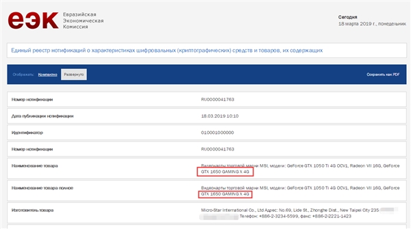 RTX 2080 Ti、RTX 2080、RTX 2070、RTX 2060、GTX 1660 Ti、GTX 1660……NVIDIA Turing图灵家族迄今已经诞生了六款桌面型号,并按照是否支持光追划分为两大阵营,涵盖了2000元出头到20000元的整个市场。 而对于需求甚低的游戏玩家来说,接下来就是GTX 1650,消息称将在4月30日正式发布,首次下探2000元以下市场。 欧亚经济委员会(ECC)再一次立功,列出了微星的GTX 1650 Gaming X 4G,证实了将会配备4GB显存的说法,而显存类型很可能第一次放弃GDDR6而改用GDDR5。 目前有关GTX 1650的规格所知甚少,只能猜测会采用最小的TU117核心(也不排除TU116核心继续动刀的微小可能),同时显存位宽削减到128-bit。 按照NVIDIA的产品线布局惯例,GTX 1650应该是图灵家族在桌面上的最后一款主要型号,当然后续肯定还会根据市场情况进行微调,变换核心、显存衍生出新的型号,就像GTX 1060 5GB/3GB。 GTX 1650预计售价179美元,国内基本锁定1799元起。 |