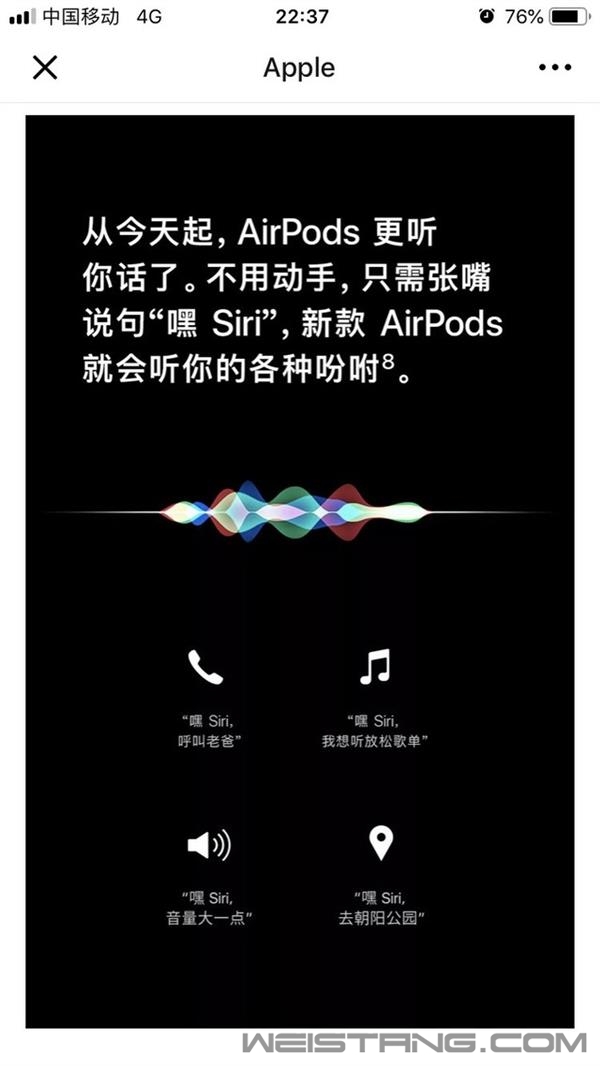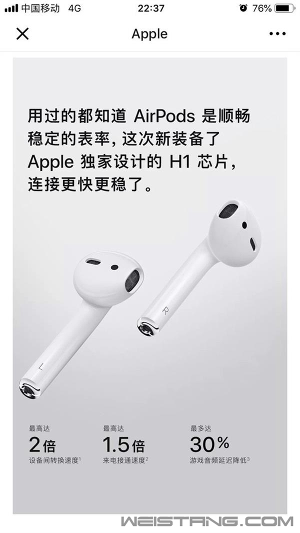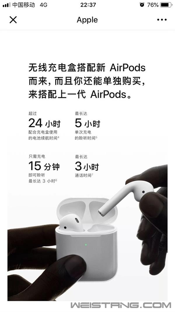 3月20日,AirPods终于迎来了更新!全新的Apple H1耳机芯片,“嘿 Siri”语音控制,全新的无线充电盒以及更长的续航。 时隔908天,全新一代AirPods终于呈现在我们面前,只不过这次来的有点悄无声息;而在大家期待的新配色方面,目前依然只有白色可选,之前外媒爆料的黑色和其他颜色,均未出现在苹果官网页面。 根据苹果官网显示,新版AirPods无线充电盒单独售价为679元,与新一代AirPods配套售价为1599元。此外,还有普通充电盒版AirPods,售价1279元。现在下单,将于3-5个工作日发货。 关于价格,以编辑来看这次新品的定价还算在可接受的范围内,但也仅此而已。 在外观设计(耳机和充电盒)和配色没有任何改变的情况下,你甚至很难辨别新老版本耳机的区别,当然更重要的是,你无法在出街的时候炫耀它了,这点恐怕会让不少人感到失望吧。 至于需不需要升级,编辑认为,如果是手里已经有第一代AirPods的朋友,大可不必升级,更没有必要单纯为了一个无线充电功能花679元购买一个无线充电盒。 而对于还没有入手AirPods的朋友来说,在预算允许的情况下,编辑倒是建议直接入手新一代AirPods。 正所谓数码产品买新不买旧,既然现在有了性能更强悍、续航更长且支持无线充电的新AirPods,就不要再惦记上一代产品了。 关于新一代AirPods,大家一定好奇它搭载的这颗H1芯片与上一代W1芯片相比都有哪些提升? 关于这个问题,苹果给出了三个数据:2倍设备间转换速度,1.5倍来电接通速度,30%游戏音频延迟降低。这就是H1芯片相比W1主要提升的地方。 此外,Apple H1耳机芯片还使用了光学传感器和运动加速感应器,可检测用户是否已将它们戴入耳中(戴上播放,摘下暂停)。 还有从今天起,你的AirPods会“更听你话”,不用动手(触碰),只需张嘴说一句“嘿 Siri”,新一代AirPods就会听你的吩咐。打电话、听音乐、查路线、播新闻等等,从此将变得更加简单和方便。 现在登录苹果官网,进入AirPods界面即可看到全新的无线充电盒,大小与普通版充电盒保持一致,可兼容Qi标准的充电器,充电盒正面的LED指示灯能显示AirPods的充电状态。 苹果还强调,如果无线充电器没在身边,用户也可以通过闪电端口充电。 续航方面,AirPods 一次充电最长可聆听5小时(或者通话3小时),再加上充电盒能存储多次额外充电的电量,可满足超过24小时的续航。 耳机同时还支持快充,只需放入充电盒中15分钟即可使用3小时。 系统要求: iPhone、iPad 和 iPod touch : 安装 iOS 12.2 或更新系统的机型; Apple Watch:安装 watchOS 5.2 或更新系统的表款; Mac:安装 macOS 10.14.4 或更新系统的机型。 蓝牙耳机将全面进入无线时代 虽然初代AirPods的热潮还未消退,但是新一代AirPods也终于算是如期而至了,很多人为了等待苹果更新这款新品,甚至放弃了很多TWS真无线耳机,这或许就是苹果独有的魅力吧。 新一代AirPods另一个重要的意义在于,让用户彻底摆脱了最后一根线,此前外媒一直爆料的新一代AirPods将支持iPhone反向充电功能,现在看来并未在苹果官网提及;但是支持无线充电这件事本身就已经令人兴奋了,这意味着接下来用户可以同时给iPhone和AirPods进行无线充电,充电线的使用频率将会大大减少。 近日,美国市场研究公司Counterpoint Research刚刚公布了一项数据:苹果公司在2018年共售出约3500万部AirPods耳机,力压索尼、Beats等,成为美国最受欢迎的无线耳机品牌。 可见,AirPods已经成为了一种文化,影视明星、体育运动员以及追逐时尚的年轻人,都是AirPods的忠实用户。 可以预见的是,在接下来的一至两年内,在新一代AirPods的引领下,国产耳机将会全面跟进并推出支持无线充电功能的TWS真无线耳机,蓝牙耳机也将全面进入无线时代。 |