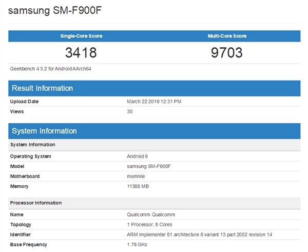 一个月前,三星正式发布了折叠屏手机Galaxy Fold,不但有内外双屏设计,其他配置也都是顶级的。 现在,GeekBench跑分数据库里出现了一款三星的“SM-F900F”,正是折叠屏Galaxy Fold,而且是国际版,证实拥有骁龙855处理器、12GB内存(LPDDR4X)。 成绩倒是一般,单核心3418、多核心9703,相比骁龙855 3500/11000+分的日常表现略低,但毕竟还不是零售版,可以理解。 Galaxy Fold将在4月26日上市,价格高达1980美元,折合人民币超过1.3万元。 该机在折叠状态下正面是一块4.6英寸的小屏幕,Super AMOLED面板,分辨率1680×720(21:9),而展开后是一块7.3英寸的无缝大屏幕,Dynamic AMOLED材质,分辨率2048×1536(4.2:3),折叠铰链号称可承受多达20万次翻折。 它还有全球首款UFS 3.0 512GB存储、480mAh电池(QC2.0有线快充与无线充电)、802.11ac与蓝牙5.0、NFC、USB Type-C、3.5mm,摄像头共有六个:正面1000万像素自拍,背面1600万超广角+1200万广角+200万像素长焦,展开后1000万+800万像素景深。 Galaxy Fold还是Mate X? |