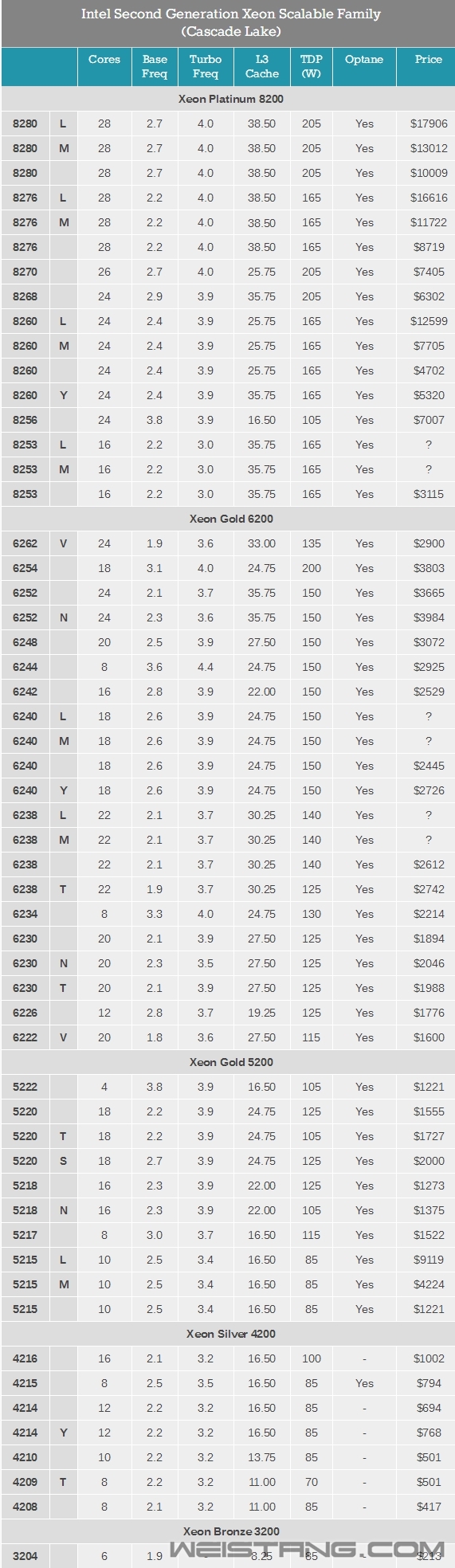 4月3日,Intel正式发布了代号Cascade Lake的第二代可扩展Xeon至强服务器处理器,工艺和架构本质上还是基于14nm Skylake-SP,但是核心数量翻番,并支持傲腾可持续内存,加强了对AI、5G应用的支持。 相比于第一代至强x100,今天的至强x200系列新品主要变化有: - 新增代号Cascade Lake-AP的铂金9200系列,内置两颗Die,最多56核心112线程,热设计功耗最高400W - 绝大多数中端型号核心数量更多,但价格不变 - 绝大多数终端型号三级缓存容量更大 - 几乎所有型号都提升了频率 - DDR4内存支持频率提高 - 几乎所有铂金、金牌系列都支持傲腾可持续内存(Optane DC Persistent Memory) - 针对特定市场增加新的CPU配置 - 增强的熔断、幽灵漏洞补丁(变种2/3/3a/4/L1TF) - 新的AVX-512 VNNI指令集 - 面向云部署的Speed Select技术 - 内置Intel DLBoost机器学习加速,推理性能提升1.4倍,并有OpenVINO软件优化 新一代产品仍然分为铂金、金牌、银牌、铜牌四大序列,具体包括铂金9200/8200、金牌6200/5200、银牌4200、铜牌3200,总计多达至少59款型号,其中新增的更高规格铂金9200系列有四款。 上代产品旗舰铂金8180最多28核心56线程,主频2.5-3.8GHz,三级缓存38.5MB,三条UPI总线,支持六通道DDR4-2666内存,最大容量768GB,热设计功耗205W,标价1万美元。 而新旗舰铂金9282通过双芯片封装的方式来到了56核心112线程,主频却提高到2.6-3.8GHz,三级缓存也翻番至77MB,UPI总线增至四条,内存支持来到十二通道DDR4-2933,最大容量1.5TB(标准版),热设计功耗高达400W,价格没说,但是你想象吧,低于3万美元算我输。 Intel强调,在双路配置中,任意CPU Die之间的延迟都只需要一个跳跃(hop),不过注意PCIe 3.0总线仍是每颗处理器40条,加上芯片组48条。 同时还有48核心96线程的铂金9242,主频2.3-3.8GHz,三级缓存71.5MB,总线和内存同上,热设计功耗350W。 32核心64线程的铂金9222/9221,最高加速均为3.7GHz,三级缓存仍有71.5MB,热设计功耗250W。 同时注意,铂金9200系列都不是LGA独立封装,而是改成了BGA整合封装,直供OEM,不会单独售卖。 金牌8280、8280L、8280M、8276、8276L、8276M六款型号都是28核心56线程,最高加速4.0GHz,三级缓存38.5MB,热设计功耗205W或者165W,价格最高的82880L达到了17906美元,8280M也有13012美元,8280则维持了上代10009美元。 新一代还针对不同市场增加了各种变种型号,以不同后缀区分,具体包括:无后缀标准版(1.5TB内存)、M中等内存支持(2.0TB)、L大容量内存支持(4.5TB)、Y、N网络和网络虚拟化、V虚拟机密集型、T长寿命和低功耗、S搜索优化。 各自规格和价格如下: |