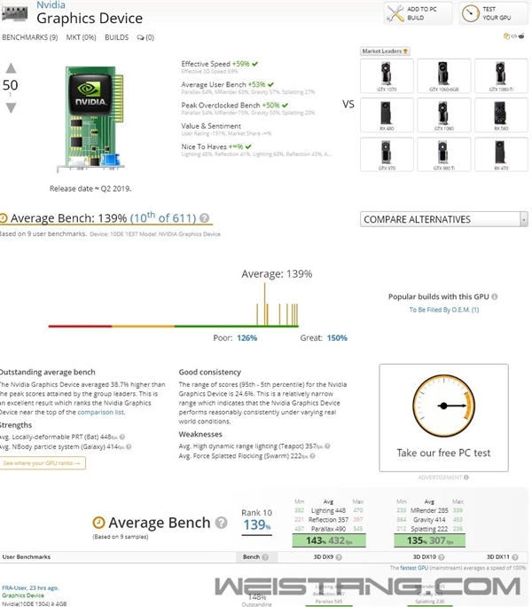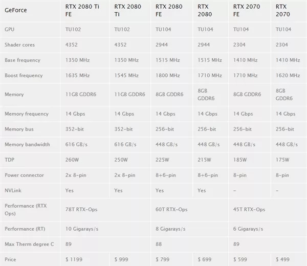 会有RTX 2070 Ti显卡?至少从UserBenchmark来看,不能排除这种可能。 设备ID为10DE 1E37的显卡出现在上述跑分软件中,成绩恰处于RTX 2070与RTX 2080之间,引发联想。 具体来说,平均成绩显示为139%,而RTX 2080是147%,RTX 2070则是131%。 规格方面,识别出来7.5GB显存(实为8GB?),2019年Q2上市。 不过,有发烧友挖掘后表示,该ID似乎对应的是Quadro RTX 6000专业卡,所以我们还是让子弹飞一会儿。 仅以硬件参数来看,RTX 2080(2944 CUDA)和RTX 2070(2304 CUDA)之间的确有继续动刀的空间,但问题在于意义多大,毕竟两者的最小市场价差只有100美元。 |