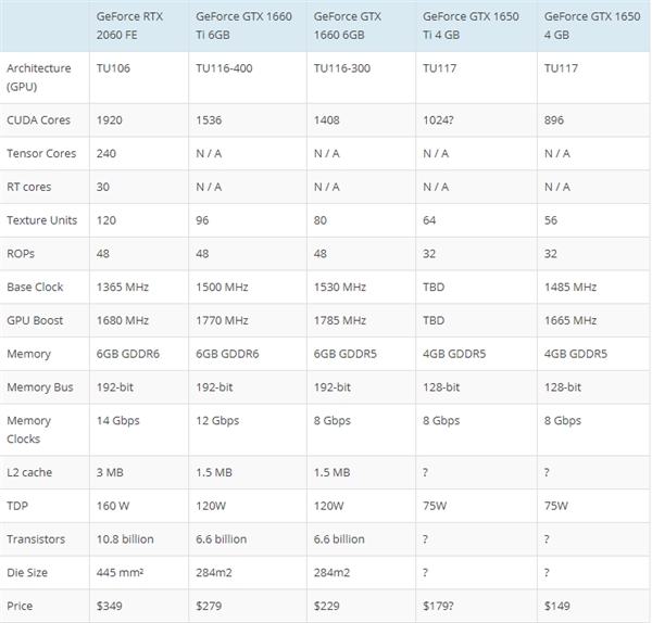 今晚21点,NVIDIA正式发布GTX 16系家族新成员,GTX 1650桌面显卡。 GTX 1650采用Turing架构的TU117-300 GPU核心,12nm工艺,内建896个CUDA,56个纹理单元、32个ROP单元,基础频率1485MHz,加速频率可达1665MHz,采用4GB GDDR5的高速显存,显存频率为8Gbps,位宽为128-bit(等效频率8000MHz,带宽128GB/s),热设计功耗仅75W。 性能方面,NVIDIA表示,1080P游戏中,GTX 1650是GTX 950的两倍强,也比GTX 1050快了70%。 规格对比 NVIDIA给出的建议零售价为149.99美元,国行方面,耕升方面公布的价格是,追风版1199元、炫光OC版则是1299元。 另外。GTX 1650并无公版卡,几乎完全放手给AIC们做非公。非公卡多新增一颗6Pin供电,同时在显示输出接口上也不尽相同。 |