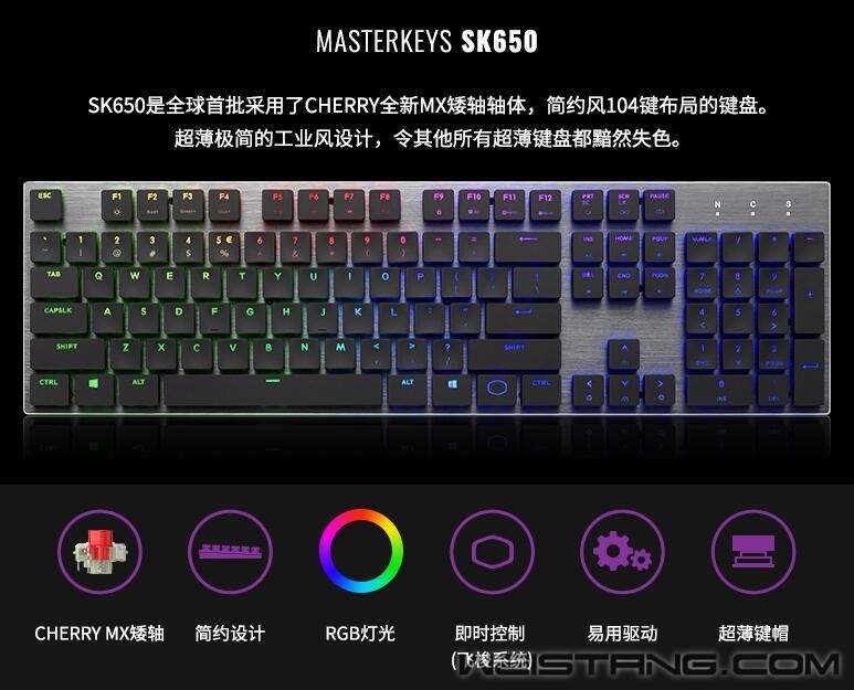 酷冷至尊全新设计语言的键盘MASTERKEYS SK系列在上市后备受关注,为了搭配Cherry MX矮轴而新出炉的设计思路,键帽大胆地采用了超薄悬浮式设计,同时加入了人体工程学优化。SK630率先上市,采用87尺寸,更适合电竞与游戏应用,属于兼顾游戏与便携性的一款键盘。今天104全尺寸的SK650正式上市,目前已经在天猫开卖,设计语言依然保持了与SK630相同的风格,并且同样是支持RGB灯光效果的Cherry MX矮轴。 Cherry MX矮轴的轴体高度降低了6.6mm,按键行程也从4.0mm降低到了3.2mm,触发行程也缩短了将近一半,只有1.2mm的水平,同时寿命依然保持在5000万次的水平,这样的表现可以说是目前机械轴中最适合游戏表现的一款轴体,更短的响应行程代表着可以实现更低的按键操作延迟,再加上德国樱桃原厂的工艺,轴体稳定性表现非常出色。 在颜值方面,酷冷至尊SK650上壳采用了灰色的拉丝铝镁合金,边缘倒角做了细致的抛光化处理,更坚固同时也很轻便。全尺寸按键增加了应用场景,可以满足几乎所有用户的键盘使用需求,并且一改传统104全键位键盘的臃肿,在视觉上让你眼前一亮。 搭配酷冷至尊的友好软件界面可以实现灯光以及按键宏定义,并且可以根据不同的应用来设置不同的配置文件,界面针对中国用户的使用习惯做了优化,简介实用同时功能丰富。 Cherry MX矮轴是樱桃第二代RGB轴体,在整体透光与柔光效果表现也更出色,搭配SK系列创新的键帽设计,灯光效果相当出色,色彩活跃同时也不会非常刺眼。 酷冷至尊SK650 Cherry 矮轴机械键盘天猫购买入口:https://detail.tmall.com/item.htm?id=592151976180&sku_properties=5919063:6536025 |