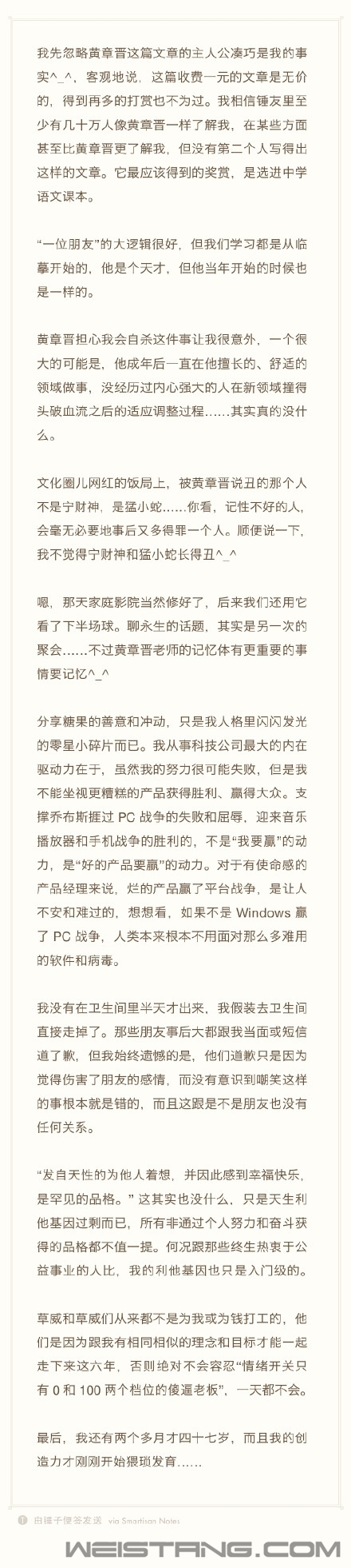 罗永浩,并没有放弃,甚至,他说自己的创造力才刚开始发育。 今晚(5月6日),罗永浩转发大象公会创办人、好友黄章晋的问答文章,话题是网友提出的“吴晓波说罗永浩一个是梦太大,一个是入错行,吴主任说罗永浩深刻地改变了世界,请问你怎么评价他们的看法?”。 罗永浩毫不吝惜地夸赞,“这篇收费一元的文章是无价的,得到再多的打赏也不为过。我相信锤友里至少有几十万人像黄章晋-样了解我,在某些方面甚至比黄章晋更了解我,但没有第二个人写得出这样的文章。它最应该得到的奖赏,是选进中学语文课本。” 老罗称自己不会走自杀这条路,因为“内心强大的人在新领域撞得头破血流之后的适应调整过程已经经历过”,他还表示,我从事科技公司最大的内在驱动力在于,虽然我的努力很可能失败,但是我不能坐视更糟糕的产品获得胜利、赢得大众。支撑乔布斯捱过PC战争的失败和屈辱,迎来音乐播放器和手机战争的胜利的,不是“我要赢”的动力,是"好的产品要赢”的动力。 他还指出“对于有使命感的产品经理来说,烂的产品赢了平台战争,是让人不安和难过的,想想看,如果不是Windows赢了PC战争,人类本来根本不用面对那么多难用的软件和病毒。” 对于黄章晋形容自己“发自天性的为他人着想,并因此感到幸福快乐,是罕见的品格。”罗永浩“顺坡下驴”,这其实也没什么,只是天生利他基因过剩而已,所有非通过个人努力和奋斗获得的品格都不值一提。 以下为老罗发声全文: 我先忽略黄章晋这篇文章的主人公凑巧是我的事实^_ ^,客观地说,这篇收费一元的文章是无价的,得到再多的打赏也不为过。我相信锤友里至少有几十万人像黄章晋-样了解我,在某些方面甚至比黄章晋更了解我,但没有第二个人写得出这样的文章。它最应该得到的奖赏,是选进中学语文课本。 “一位朋友”的大逻辑很好,但我们学习都是从临摹开始的,他是个天才,但他当年开始的时候也是一样的。 黄章晋担心我会自杀这件事让我很意外,一个很大的可能是,他成年后一直在他擅长的、 舒适的领域做事,没经历过内心强大的人在新领域撞得头破血流之后的适应调整过程....其实真的没什么。 文化圈儿网红的饭局上,被黄章晋说丑的那个人不是宁财神,是猛小....你看,记性不好的人,会毫无必要地事后又多得罪一个人。顺便说一下,我不觉得宁财神和猛小蛇长得丑^ ^ 嗯,那天家庭影院当然修好了,后来我们还用它看了下半场球。聊永生的话题,其实是另-次的聚.....过黄章晋老师的记忆体有更重要的事情要记忆^ ^ 分享糖果的善意和冲动,只是我人格里闪闪发光的零星小碎片而已。我从事科技公司最大的内在驱动力在于,虽然我的努力很可能失败,但是我不能坐视更糟糕的产品获得胜利、赢得大众。支撑乔布斯捱过PC战争的失败和屈辱,迎来音乐播放器和手机战争的胜利的,不是“我要赢”的动力,是"好的产品要赢”的动力。对于有使命感的产品经理来说,烂的产品赢了平台战争,是让人不安和难过的,想想看,如果不是Windows赢了PC战争,人类本来根本不用面对那么多难用的软件和病毒。 我没有在卫生间里半天才出来,我假装去卫生间直接走掉了。那些朋友事后大都跟我当面或短信道了歉,但我始终遗憾的是,他们道歉只是因为觉得伤害了朋友的感情,而没有意识到嘲笑这样的事根本就是错的,而且这跟是不是朋友也没有任何关系。 “发自天性的为他人着想,并因此感到幸福快乐,是罕见的品格。”这其实也没什么,只是天生利他基因过剩而已,所有非通过个人努力和奋斗获得的品格都不值一提。何况跟那些终生热衷于公益事业的人比,我的利他基因也只是入门级的。 草威和草威们从来都不是为我或为钱打工的,他们是因为跟我有相同相似的理念和目标才能一起走下来这六年,否则绝对不会容忍“情绪开关只有0和100两个档位的傻逼老板”,-天都不会。 最后,我还有两个多月才四十七岁,而且我的创造力才刚刚开始猥琐发育.... |
