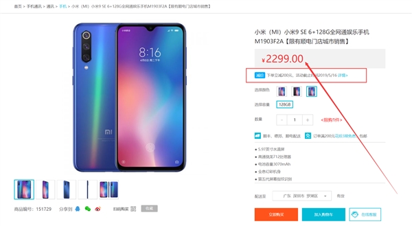 5月11日消息,小米9 SE 6GB+128GB版在顺电网上商城下单立减200元,到手价为2099元,在同价位极具竞争力。 小米9 SE是小米2019年推出的“小屏旗舰”,小米创始人、小米集团董事长兼CEO雷军表示,和小米9对比,小米9 SE堪称是小屏版小米9。它们拥有7大相同点,具体如下: 1、相同的全息幻彩工艺; 2、相同的后置索尼4800像素IMX586; 3、相同的前置2000万像素美颜相机; 4、相同的第五代屏幕指纹极速解锁; 5、同款的三星AMOLED屏幕,相同的分辨率; 6、相同的多功能NFC和红外遥控; 7、相同的UFS 2.1高速存储; 核心配置上,小米9 SE采用5.97英寸显示屏,首发高通骁龙712移动平台,前置2000万像素,后置4800万广角镜头+800万长焦镜头+1300万超广角镜头,电池容量为3070mAh。 |