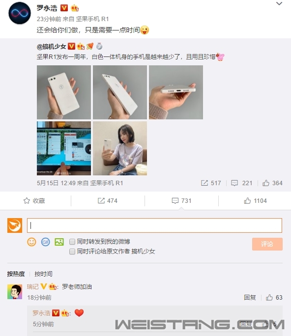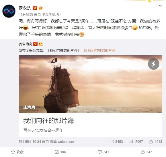 尽管无数的声音说锤子败了,但“不”字始终没有从罗永浩口中说出。 今天凌晨(5月16日),罗永浩转发网友上手坚果R1纪念发布一周年的微博,写道“还会给你们做,只是需要一点时间[挤眼]”。 由此来看,罗永浩的“做机”之旅并未终结,他还未放弃。 随后,罗永浩还转发了产品经理朱海舟的文章《我们向往的那片海》,文辞恳切,娓娓道来,这里贴出来以飨读者,尤其是那些关心老罗命运的锤粉们—— |