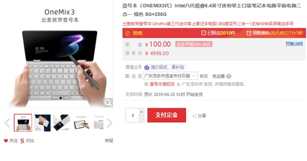 5月18日消息,壹号本OneMix 3系列新机已在京东开启预售,将于6月22日开始发货。作为第三代迷你掌上笔记本电脑,其屏幕8.4英寸、仅重650g,售价4999元,定金100抵300。 壹号本OneMix 3 采用8.4英寸超清触控显示屏,分辨率为2560x1600,机身尺寸为204x129x14.9mm,重量为0.65kg,适合需要便携的移动办公用户选择,为商务差旅消费者量身打造的随身利器。 壹号本OneMix3采用360度二合一翻转设计,是一款变形翻转本,平板笔记本多种使用模式,并支持键盘背光,支持快捷开启和关闭。 核心配置上,壹号本OneMix 3搭载英特尔酷睿M3-8100y处理器+PCIe板载固态硬盘。支持M.2接口,可以扩展双固态硬盘,标配8GB内存,作为一款掌上口袋笔记本,其性能同主流超极本看齐。 此外,其压感触控手写升级为4096压感,同时支持适配微软手写笔。电池容量增加为8600mAh,支持手机充电器充电。 |