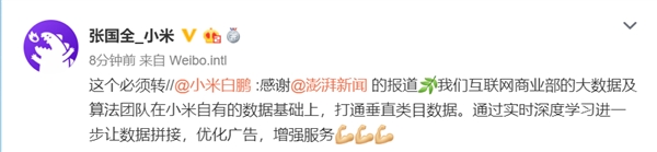 之前小米创始人、小米集团董事长兼CEO雷军在与米粉互动时表示,小米会坚决去掉那些影响用户体验的“电线杆广告”和低俗的“老军医广告”。 5月22日消息,小米互联网商业部总经理白鹏接受采访时表示,做商业化通常是广告位越多,赚更多的钱。但我们要克制,小米现在要把广告位减少,让每个广告位实现千人千面的算法,提高触达效率,让用户觉得我们推送的广告是用户需要的。 白鹏表示,现在成立互联网商业部就是要减少和优化广告,提升用户体验。新部门希望让每个广告位都提高效率,通过算法精准给用户推送广告,用户点击了我们向品牌主收小费,其实就这么一个方式。 小米2019年Q1财报显示,小米集团互联网业务收入共计人民币43亿元,同比增长31.8%。来自中国手机广告和游戏之外的互联网收入占互联网业务总收入的31.8%,同比增长167.3%,MIUI月活用户达到了2.61亿,同比增长了37.3%。 官方表示,2018年小米集团对核心战略、组织管理、技术研发、产品品牌等进行了一系列重要调整与升级,其积极效果在本季度内逐步显现。 本季度内,小米集团正式启动“手机+AIoT”双引擎战略作为未来5年的核心战略,在双引擎战略推动下,2019年Q1营收、利润全面超预期。 |