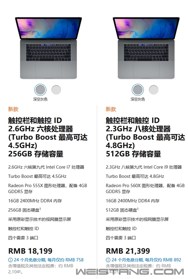苹果刚刚发布的新MacBook Pro系列,已经悄悄在中国官网上架了,你们是不是入手了? 从配置上来说,这次苹果为新MacBook Pro配备了速度更快的第八代和第九代英特尔核心处理器,而新款8核MacBook Pro比4核MacBook Pro快两倍,比6核MacBook Pro快40%。 除了配备速度更快的处理器以外,新款MacBook Pros还采用了升级换代后的蝴蝶(Butterfly)键盘技术,当然如果你的键盘使用中如果出现问题,是可以找官方售后来免费维修的。 至于大家关心的售价,新版MacBook Pro已经在国内官网上架,其中13英寸新版售价是13899元和15499元,而15寸新版售价是18199元和21399元。 另外,苹果给出的公告显示,2016年10月至2018年2月之间售出的部分13英寸MacBook Pro,将可能存在一些问题,主要来说有两点,第一显示屏背光沿整个屏幕底部持续或间歇性显示垂直的明亮区域,第二是显示屏背光完全停止工作。如果你的设备是这个时间点内的,那么可以去联系官方售后免费维修。 |