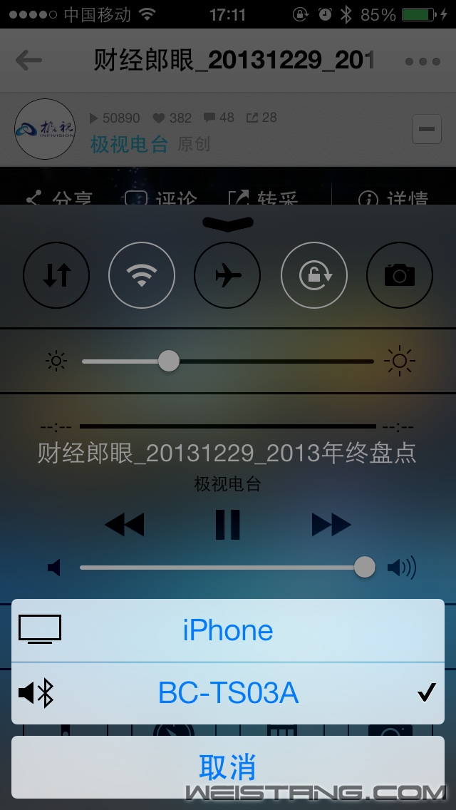 本文以iphone 5s的附件耳机Apple EarPods为例来测试一下BC-TS03A的效果,首先单纯是播放音乐的话,相比直连iphone 5s或者ipad的情况,BC-TS03A最大特色就是人声的解析度很高,高频出色,而低频表现就没用iphone 5s或者ipad air那么扎实有力了,不过单纯听人声或者乐器的话BC-TS03A到也是不错的选择。说完了三段听感,再说说音量,对于Apple EarPods耳机来说,这是完全为水果手机和平板量身定制的耳机,而在音乐播放的音量方面,就我的听力来看,如果直连iphone 5s或者ipad air,音乐播放音量我可以开到差三个格满的样子,而介入BC-TS03A后音量只能开到一半,这样的驱动能力驾驭 EarPods这类耳塞来说是没问题的。 播放音乐 播放音乐 另外一种应用就是我们想躺在床上或者在厨房听听手机里的网络广播节目的话,同样使用BC-TS03A也非常方便,这个时候我们可以外接一款音箱设备,根据不同环境我们就可以轻松选择音源而不用改变音源的位置了,特别是那些睡觉前喜欢听些东西还不喜欢把手机放在枕边的朋友。 应用 自由切换音频输出设备 配合原本的有线耳机实现蓝牙接入来进行通话也非常方便,BC-TS03A配合我手上的原装Apple EarPods耳塞的通话质量非常清晰,如果不习惯EarPods通话那种降噪后渲染的效果的话,我想BC-TS03A强化人声解析带来最好的应用就是配合耳机作为蓝牙通话设备了。 接打电话应用 BC-TS03A作为蓝牙耳机适配器与手机配合的时候,来电时可按一下开关接通来电,通话中按一下开关即挂断通话,当来电时长按开关键3秒可以挂断来电。连续按开关2次可以拨打最后一次拨打的电话。