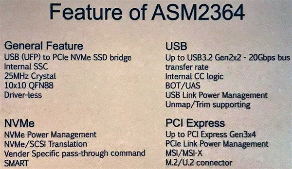 台北电脑展上,祥硕(ASMedia)宣布已经率先完成USB 3.2 2x2主控制器,并进行了公开演示。 祥硕的新主控方案包含两个部分,其一是xHCI主控制芯片“ASM3242”,其二是PCIe NVMe SSD桥接芯片“ASM2364”,利用了PCIe 3.0 x4接口,理论带宽4GB/s,可以完全满足USB 3.2 20Gbps(2.5GB/s)的带宽需求,并支持NVMe。 该方案是祥硕完全自主研发,从PHY到控制电路都是如此。 祥硕透露,将在8月份向客户批量出货这款新主控,预计首款支持USB 3.2的设备今秋面世,也就是标准发布后大约两年。