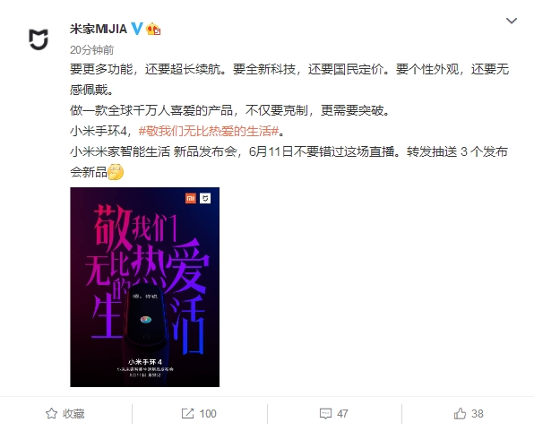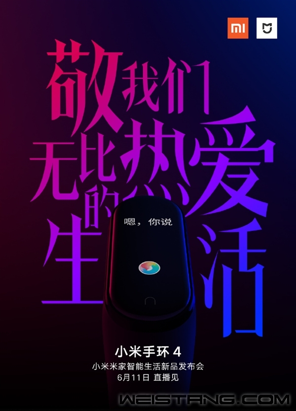 6月4日消息,今天米家正式官宣:小米手环4将于6月11日发布。 米家发文称:“要更多功能,还要超长续航。要全新科技,还要国民定价。要个性外观,还要无感佩戴。做一款全球千万人喜爱的产品,不仅要克制,更需要突破。小米手环4,#敬我们无比热爱的生活#。” 从预热海报来看,小米手环4支持小爱同学,而且小爱同学语音的标记是彩色的,这也确认了小米手环4升级为彩屏。 从官方文案来看,小米手环4具备个性外观、无感佩戴、超长续航、更多功能、国民定价等特色。 此前蓝牙组织和NCC的认证库资料显示,小米手环4同样有蓝牙和NFC两款,升级为蓝牙5.0标准,电池容量从110mAh提升为135mAh。 日前,有博主曝光了一组疑似小米手环4实物图。体积和上代差不多,最大的进步在于屏幕换成了彩色屏,视觉效果明显提升了一个档次。 |