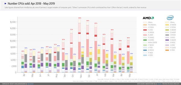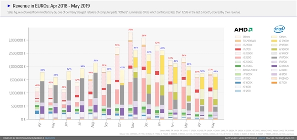 AMD在刚结束的台北电脑展上推出了第三代锐龙处理器,基于7nm Zen 2架构,首批5款产品将于7月7日上市,国行1599元起(锐龙5 3600)。 就目前的市场态势来看,三代锐龙可以说是AMD的乘胜追击之举,来自德国大型硬件销售商MINDFACTORY的最新统计显示,刚过去的5月份,锐龙CPU/APU的销量占比为66%,Intel酷睿则只有34%。 销量柱状图 从历史列表来看,AMD已经连续10个月在处理器销量方面明显压制Intel。在售产品中,AMD卖得最好的型号是锐龙5 2600,Intel这边则是i9-9900K。 销售收入柱状图 不过,由于Intel处理器均价高,划算成收入后,AMD营收份额占比降为51%。 考虑到三代锐龙在单核性能、多核性能、制程工艺、核心数上对Intel 9代酷睿实现了全方位超越,未来三个月的市场表现极为可观。 |
