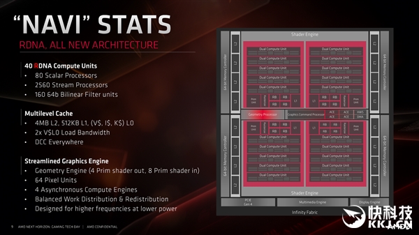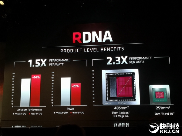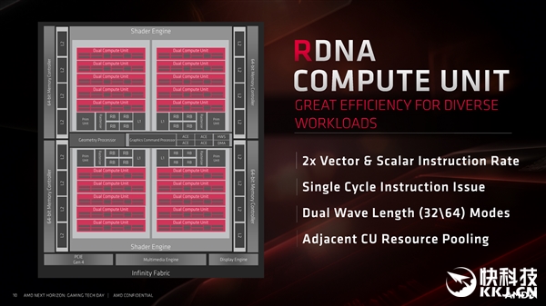 AMD发布的新一代RX 5700系列显卡基于7nm新工艺和Navi新核心,而在底层是全新的RDNA架构,已经走过七年半的GCN架构就此挥手作别。 这些年来,很多用户玩家尤其是A饭一直期待一个全新的GPU架构,但这种事儿的难度远超一般人想象,某种程度上设计一个新的GPU架构甚至要比设计一个新的CPU架构还要难。RDNA架构就花费了AMD研发团队长达四年的时间,凝聚了无数人的心血,也开启了AMD显卡历史上第五代重大架构的新时代。 2000年前,R100核心是A卡的第一代架构,用的还是固定单元设计,3D几何转换和光照效果如今看起来都极为原始。 2001-2007年的R200-R500是第二代架构,简单的VS纹理着色器、PS像素着色器分离式设计,不同的只是比例不同,整个渲染流水线就像一个单通道的单行道。 2008-2011年的第三代TeraScale架构(代表核心R600)实现了一个飞跃,VS、PS融合为统一着色器,也就是我们常说的流处理器,支持VLIW(超长指令字),然后就是2011-2019年的GCN架构(代表核心Southern Islands),统一着色器加独立的标量、矢量单元,二者比例为1:4。 如今,我们迎来了全新的RDNA(Radeon DNA),还是统一着色器,但标量和矢量单元走向融合,支持SIMT(单指令多线程) ILP(指令集并行),类似CPU处理器的SIMD(单指令多数据流),单线程性能和指令集执行效率大大提升。 需要强调的是,RDNA是一个全方位重新设计的架构,并不是GCN的又一个升级版,也不是与GCN的混合体,只是集成了GCN架构的指令以保持向下兼容,现有技术仍然可以在RDNA架构上得到支持。 RDNA架构将是AMD GPU显卡未来多年的基石,接下来我们将看到采用7nm+工艺的第二代版本RDNA 2,看路线图有望明年初和我们见面。 除了RDNA新架构,Navi核心还有7nm工艺、GDDR6显存、PCIe 4.0总线、Radeon媒体引擎、Radeon显示引擎等诸多全新特性。 Navi 10核心集成了103亿个晶体管,相比Vega 64 125亿个少了大约18%,而核心面积只有251平方毫米,相比Vega 64 495平方毫米更是小了足足一半,因此单位面积性能提升了足足1.3倍。 尽管晶体管更少、面积更小,Navi 10核心的性能相比于Vega 64却提升了14%,同时功耗降低了23%,能效比因此大涨50%。 纯架构性能上,Navi相比于Vega在同等功耗、同等配置下提升多达50%,反应到实际产品上,这贡献了产品性能提升的60%左右,另外有大约25%来自7nm新工艺的加持,还有约15%来自频率以及功耗的改进。 AMD表示,RDNA架构的设计理念主要有四个方面,性能上要满足在现代游戏负载需求,能效上要充分优化功耗和带宽利用率,功能上要壮大生态,扩展性上要从移动到桌面到云端通吃。 为实现上述目标,RDNA架构主要从三大方面进行了变革,包括CU计算单元、缓存、流水线,接下来我们逐一和大家分享,但鉴于GPU架构的技术性太强,我们只是蜻蜓点水地大致看一下,最后还有AMD关于光线追踪的规划。 新的计算单元设计一共分为40组,每组2个标量处理器、64个流处理器、4个64位双线性过滤单元,总计80个、2560个、160个,执行延迟更低,单线程性能更强,缓存效率更高,整体计算能效比GCN架构有着巨大的提升,而且可适应从游戏到计算各种负载。 多级缓存一致性可以带来更低的延迟、更高的带宽、更低的功耗,包括各处零级缓存、512KB一级缓存、4MB二级缓存。 整个图形引擎也做了重新调整,更加顺畅高效,包括几何引擎、64个纹理单元、4个异步计算引擎(ACE),负载分配更加均衡,可以在更低的功耗下达成更高的频率,能效更高。 |