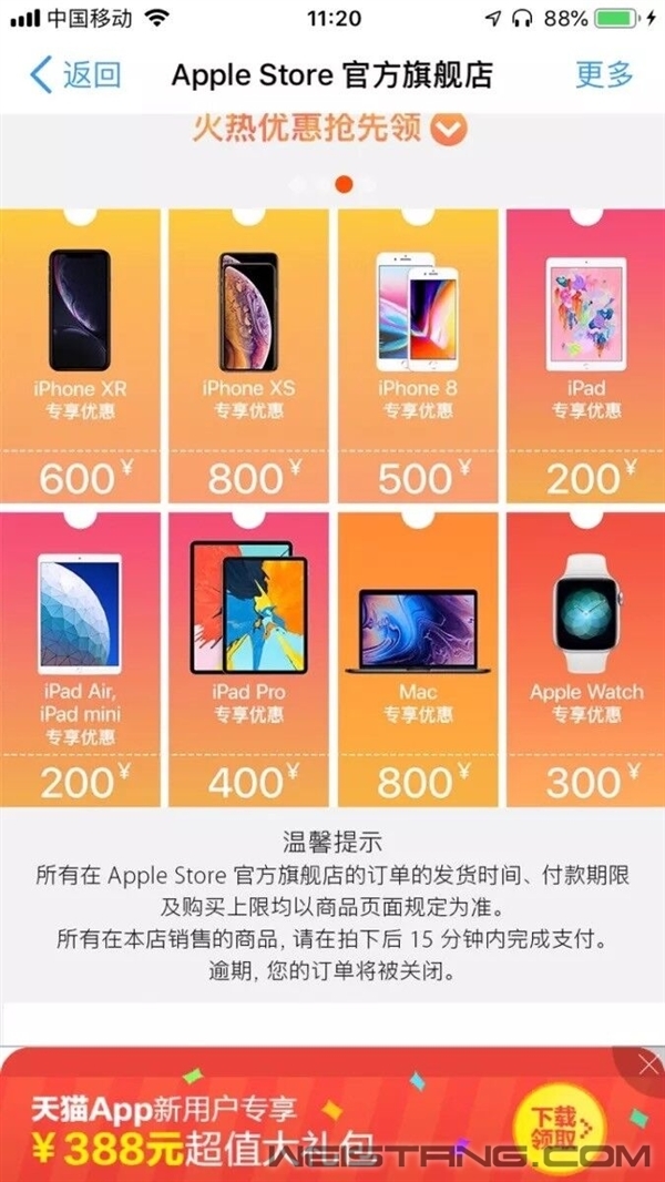苹果官方首次参加天猫618,苹果天猫官方旗舰店全线产品参与打折。 目前,在Apple Store官方旗舰店可领取800至200元不等的专享优惠券,覆盖iPhone Xs/XR/Max、iPad mini、iPad Air、Mac、Apple Watch等苹果热门产品,适用于6月16日至18日。 据了解,苹果官方参加天猫618尚属首次,此前在国内仅参加过天猫双11。本次苹果官方让利也仅限于Apple Store天猫官方旗舰店,苹果官网、Apple Retail Store门店均不参与。 |