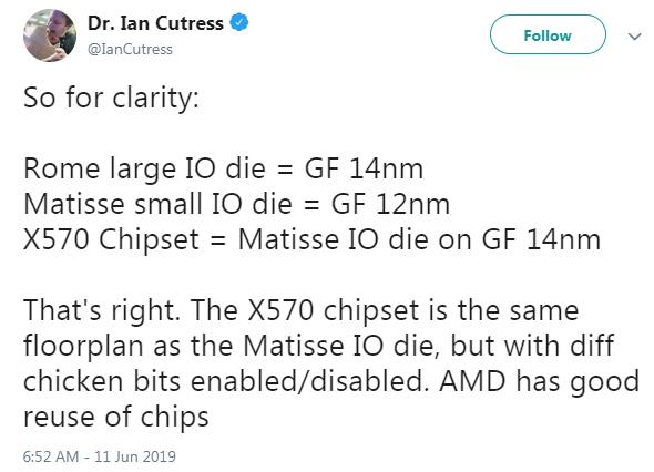 在台北电脑展以及日前的E3游戏展上,AMD接连推出了第三代的锐龙3000处理器,涵盖了6核到16核心范围,使用了全新的Zen2架构及7nm工艺。准确地说,锐龙3000的CPU Die是7nm的,实际上内部还有独立的IO核心,之前AMD表示这个IO核心会使用GF的14nm工艺。 AMD这种不同核心使用不同工艺的设计就是Chiplets,其实从去年发布64核Rome罗马处理器时大家就知道了,锐龙3000不同之处在于CPU核心没那么多,只有2组8核+1组IO核心,而罗马是8组8核CPU+1组IO核心组成。 日前Anadntech编辑Ian Cutress又公布了新的信息,原来锐龙3000(代号Matisse)的IO核心跟罗马处理器的核心也是不一样的,罗马处理器的IO核心是GF 14nm工艺的,锐龙3000的IO核心是GF 12nm,它是GF公司在14nm工艺基础上改良优化的工艺,Zen+架构的二代锐龙就是12nm工艺的产物。 最让人意外的要属X570芯片组了,此前传闻X570芯片组是28nm工艺的,不过这里的爆料称X570其实就相当于14nm工艺版的锐龙3000处理器的IO核心,它的布局跟Matisse IO核心是一样的,就是多了或者少了部分功能。 简单来说,AMD这样做就是最大化利用各种核心,CPU核心对晶体管密度、性能、功耗敏感,上最先进的7nm工艺很有帮助,而IO核心及X570南桥芯片不需要先进的工艺,复用成熟工艺可以省钱。 |