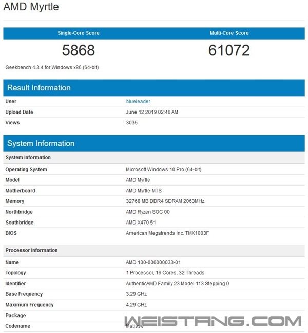 本届E3,AMD发布了基于7nm Zen2架构的16核32线程旗舰处理器锐龙9 3950X,海外749美元,国行5999元,9月发售。 由于全面的性能对比还需要一段时间才能出炉,我们只能通过一些零星的跑分来感受3950X的魅力。 在GeeBench 4.3数据库中已经有了3950X的成绩,单核5868,多核61072。猜猜Intel当家旗舰i9-9980XE(18核36线程)的成绩如何?单核5395、多核46618……也就是说,AMD不仅完成双杀,多核更是领先31%之多。 如果考虑价格的话则更让人不可思议,i9-9980XE海外价格要2000美元,国行现售1.7万元。 另外,仔细观察这份跑分,频率是3.3/4.3GHz,要比官方零售版的3.5/4.7GHz低,换言之,3950X的实力远不止于此…… 其实,在E3发布会上,AMD拿来和3950X对比性能的是9960X(16C32T),甚至还特意选取Win10 v1809和未打MDS漏洞补丁的测试环境,以避免Intel处理器被削弱20%甚至更多的性能。 |