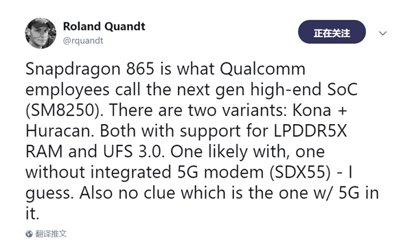 6月17日消息,高通骁龙855旗舰平台已经商用,有关下一代旗舰平台骁龙865的信息开始被曝光,消息人士称高通骁龙865旗舰平台将会支持LPDDR5X内存和UFS 3.0闪存。 知名爆料人士Roland Quandt透露,高通骁龙865旗舰平台内部代号是SM8250,它将分为两个不同的版本,其中一版代号为Kona,另一版代号为Huracan,它们都将支持LPDDR5X内存及UFS 3.0闪存,二者区别在于一款集成了高通骁龙5G调制解调器,另一款则没有。 有媒体指出,这样的设计合情合理。虽然高通骁龙855也能够实现5G连接,但是需要外挂高通骁龙X50调制解调器。 目前全球市场正式商用5G的地方还很少,5G可能会在未来一两年内才会逐渐覆盖,有的地区甚至更慢,推出不支持5G的骁龙865移动平台,将会减少相关设备的成本支出,预计价格会更具竞争力。 另外关于LPDDR5X内存,报道称它比LPDDR4X提高了1.5倍传输效率,功耗降低30%左右,值得期待。 |