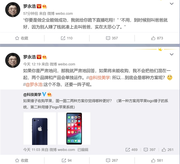 昨晚,罗永浩在与网友互动时被问道“准备收购苹果?”大方回应,还需要一点时间。 一石激起千层浪,相关话题迅速在科技圈发酵。@科技美学 就想象了未来的“锤果”手机形态,第一种方案用苹果logo锤子的系统,第二种用锤子logo苹果系统。没想到,罗永浩饶有兴致地点评,“这个不急,还要一阵子呢。” 路转黑的网友先后泼冷水,比如“别意淫了”“梦想和白日梦还是有区别的”,罗永浩看在眼里,急在心里,挨个回复“这社会到底怎么了?总鼓励大家要 dream big,真来了大的又阴阳怪气的。”“所以我们一穷二白的艰辛开始,六年卖了几百万部手机,虽然走得很不顺利,但还在努力工作,没有放弃梦想......这些在你们那儿都归在白日类?”。 刚刚,他再次亮明态度,“如果你是严肃地问,那我就严肃地回答,如果将来能收购,我不会把他们混在一起,两个品牌和产品会单独运作”。 |