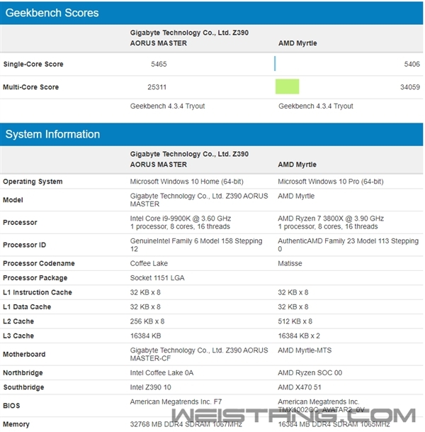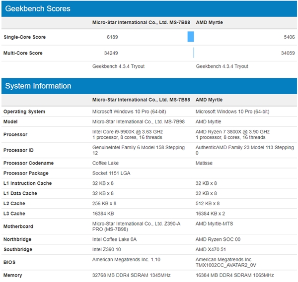 赶在7月7日上市前,三代锐龙家族的新成员们开始频繁现身跑分软件。 经查,8核16线程的锐龙7 3800出现GeekBench 4中,旋即有发烧友翻出i9-9900K,并做横向对比。 基本参数上,两款CPU都设计为8核16线程,价格相仿(3800X首发价2999元,目前9900K国行4099元)。 更具体的规格差异可参见下表: 在第一份GB4表格中,i9-9900K单线程6189,多线程34249;锐龙7 3800X单线程5406,多线程34059,也就是分别落后对手13%和1%。 在第二份GB表格中,i9-9900K单线程5465,多线程25311;锐龙7 3800X单线程5406,多线程34059,也就是分别落后对手2%和领先34%。 出现这样的差异是因为第一套Intel平台中的内存为DDR4-2667,第二套平台为DDR4-2133,而用于对比的AMD平台同样是DDR4-2133。 由于GB4对桌面CPU的考察很粗略,关于锐龙7 3800X、i9-9900K谁与争锋的话题,还是等待专业的媒体评测吧。 |