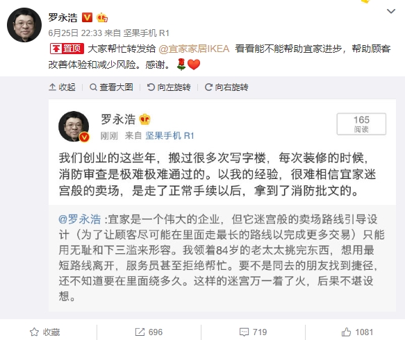 6月26日消息,日前,罗永浩在微博上diss宜家,他表示“宜家是一个伟大的企业,但它迷宫般的卖场路线引导设计(为了让顾客尽可能在里面走最长的路线以完成更多交易)只能用无耻和下三滥来形容。” 罗永浩透露,自己领着84岁的老太太挑完东西,想用最短路线离开,服务员甚至拒绝帮忙。要不是同去的朋友找到捷径,还不知道要在里面绕多久。这样的迷宫万一着了火,后果不堪设想。 罗永浩坦言,自己创业的这些年,搬过很多次写字楼,每次装修的时候,消防审查是极难极难通过的。“以我的经验,很难相信宜家迷宫般的卖场,是走了正常手续以后,拿到了消防批文的。” 有网友评论称:“要不咱们像当年怒斗西门子一样把买的宜家家具砸了”。对此罗永浩回复称:“怎么可能?西门子是流氓公司,宜家整体上很好。” |