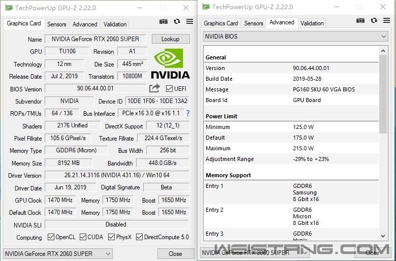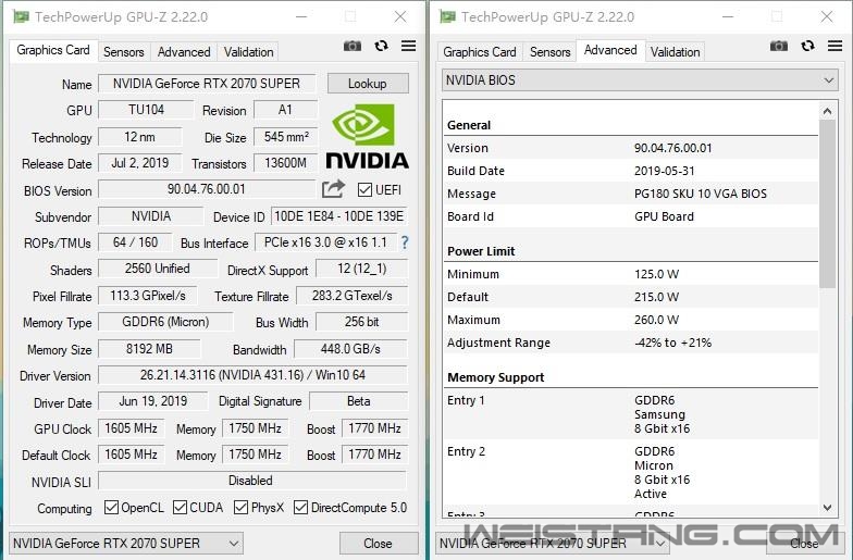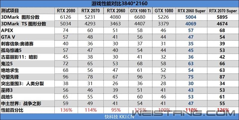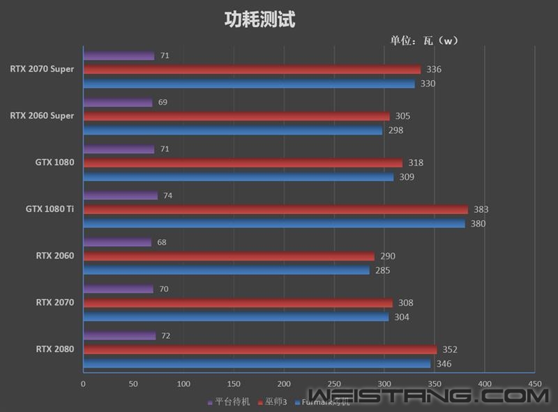 一、前言:加量不加价 RTX 2060/2070 Super上市迎战Navi 这个世界,有竞争力才会有进步!2019年4月24日,NVIDIA图灵家族最后一块拼图GTX 1650发布之后,NVIDIA已完成图灵GPU的全部布局。然而世事如棋,AMD在5月底的台北电脑展上预告了Navi构架的RX 5700/5700XT将于7月份上市,并且在性能上分别压制了RTX 2060和RTX 2070,并且价格更低。 显然NVIDIA不是Intel,不会放任AMD肆意抢夺自己的市场份额。让RTX 2080放低姿态迎战RX 5700 XT显然不是上策,财大气粗的NVIDIA选择研发新的GPU重获优势,于是就有了RTX 2060 Super、RTX 2070 Super以及RTX 2080 Super。 RTX 2060 Super与RTX 2070/2060一样都是采用了TU106核心,但是规格上相比RTX 2060有了相当大的提升,流处理器从1920个提升到2176个,ROPs从48个提升到了64个,GDDR6显存则从192-bit 6GB增至256-bit 8GB,频率维持14GHz,按照NVIDIA的说法,至少提升了15~20%的性能,干掉GTX 1080不成问题。 由于完整的TU106核心流处理器数量是2304个,因此RTX 2070 Super只能改用更高阶的TU104核心,并做适当的阉割。和RTX 2070相比,最大的变化是流处理器数量从2034个提升到2560个,原来的144个纹理单元也对应增加到了160个,显存规格维持不变,依旧是14Gbps 频率和8GB容量。NVIDIA的说法是RTX 2070 Super的性能可以看齐GTX 1080 Ti。 至于RTX 2080 Super,NVIDIA当初发布RTX 2080时留了一手,没有使用完整的TU104核心,此次RTX 2080 Super算是TU104的完全体,拥有3072个流处理器,192个纹理单元。由于RTX 2060/2070 Super都是增加了256个流处理器,而RTX 2080 Super只多了128个,为了进一步提升性能,NVIDIA选择将显存频率从原来的14Gbps提升到15.5Gbps,因此显存带宽也就达到了496GB/s。 RTX 2060/2070/2080 Super的参数规格如下: 从上面的表单可以看出RTX 2060 Super的提升幅度最大,如果将RTX 2060就此拿掉,在RTX 2060 Super与GTX 1660 Ti之间就有有巨大的真空区存在,因此RTX 2060 Super上市之后,将会与RTX 2060共存。价格方面,RTX2060 Super定价为399美元,比RTX 2060贵了50美元。 而RTX 2070/2080 Super在正式上市铺货之后,在价格上与原有的RTX 2070/2080完全一致,也就是加量不加价,而RTX 2070/2080则会彻底退出市场。 RTX 2060 Super GPU-Z截图 RTX 2070 Super GPU-Z截图。 二、RTX 2060 Super图赏:经典的双风扇煤气灶造型 RTX系列显卡一脉相承的煤气灶造型,RTX 2060后面的Super后缀格外醒目。 背部有这一块非常有分量而且看上去质感不错的一体化金属背板,能够辅助散热并加固显卡。中间同样少不了“RTX 2060 Super”的Logo。 2个DP1.4、1个HDMI2.0、一个DVI以及一个Type-C接口。 RTX 2060 Super比较难拆,拆出来之后,发现其构造设计和RTX 2070几乎完全一样。 由于PCB板较短,RTX 2060 Super的8Pin供电口并没有焊在PCB板上,而是通过延长线固定在背板上。 RTX 2060 Super采用6+2相供电设计,同样也是与公版的RTX 2070完全相同。 PCB板背面。 TU106-410-A1核心,不带A也就是出厂未预超频的版本,在完整的TU106上稍稍阉割了一下,拥有34组SM单元2176个流处理器、272个Tensor Core以及34个RT Core。基础频率1470MHz,Boost频率则为1650MHz, 显存使用了来自美光的GDDR6颗粒,频率14000MHz,单颗容量1GB,一共8颗组成256Bit 8GB,显存带宽达到了448GB/s。 三、RTX 2070 Super图赏:外观与内部构造与RTX 2080几乎完全一致 同样的双风扇煤气灶造型,中间的“RTX 2070 Super”Logo格外醒目。 标准配置的视频接口,有两个DP 1.4、两个HDMI 2.0和一个Type-C。 底部视角图。 顶部视角图。 拆解后可以看到起构造完全沿用了RTX 2080公版的设计。 均热腔散热板,理论上散热效能比热管要好很多,上面有大量的导热背胶,可使散热器可以完美贴合PCB上每一个发热的元件,显卡不会出现某个部分温度过高的情况。 拆开扇热器后的PCB本体,和RTX 2080的PCB板完全一样,供电部分采用了8相核心+2相显存的供电方案,并且大量采用了高端的钽电容。 TU104-410-A1核心,同样也是不带A出厂未预超频的版本,在完整的TU104上稍稍阉割了一下,拥有40组SM单元2560个流处理器、320个Tensor Core以及40个RT Core。基础频率1605MHz,Boost频率则为1770MHz, 显存使用了来自美光的GDDR6颗粒,频率14000MHz,单颗容量1GB,一共8颗组成256Bit 8GB,显存带宽达到了448GB/s。 性能测试:3DMark成绩只作参考 将测试结果汇总如下: 在2K分辨率下,RTX 2060 Super在绝大部分游戏中都可以拥有超过60FPS的帧率,在性能上领先RTX 2060 13.5%,领先GTX 1080 9%。 RTX 2070 Super相比RTX 2070有11%的性能优势,在性能上则完全等同于GTX 1080 Ti。 限于篇幅,我们将4K分辨率的测试结果汇总于下表,而不再做一一的阐述。 4K分辨率以RTX 2060 Super的性能而言难以胜任,在这个分辨率下,它可以领先RTX 2060 16%,领先GTX 1080 10%。 RTX 2070 Super表现稍好一些,除了《刺客信条:奥德赛》、《古墓丽影:暗影》以及《突出重围:人类分裂》之外,在其他9款单机大作中,它都能在最高特效下达成50FPS以上的帧率,稍微降低部分特效,60FPS也不是很难的事情。 在性能上,RTX 2070 Super可以领先RTX 2070 11%,比GTX 1080 Ti刚好强了1%。 与1080P分辨率同样的情况,帕斯卡GPU在《APEX 英雄》中的表现非常不好,GTX 1080 Ti的帧率仅与RTX 2060 Super相当,远远落后用户RTX 2070 Super。若剔除这个游戏,GTX 1080 Ti的整体性能至少能持平RTX 2070 Super。 功耗与温度测试:烤机最高75度 1、功耗测试 就TDP而言,RTX 2060 Super 175W要比RTX 2060高了15W;而RTX 2070 Super则达到了215W,比RTX 2070高了足足40W,比RTX 2080的225W只少10W。 分别测试待机、游戏以及FurMark烤机时的整机功耗,测试所用的电源为酷冷至尊V85