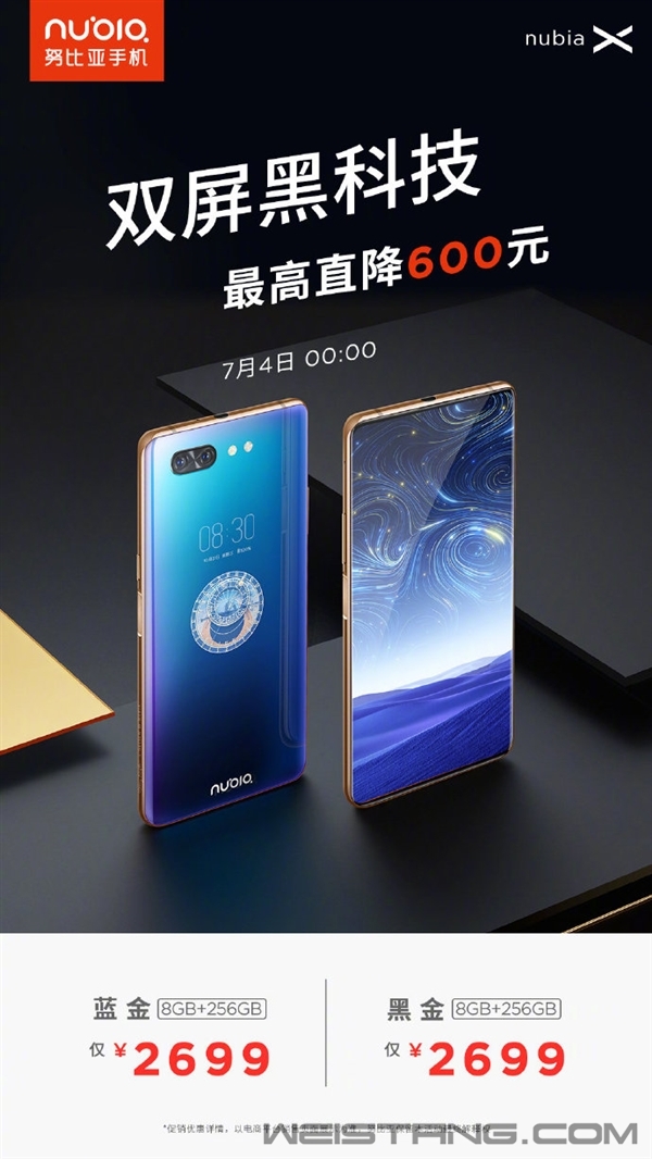 7月3日消息,努比亚宣布7月4日0点起努比亚X最高直降600元,8GB+256GB版仅售2699元(蓝金、黑金配色)。 努比亚X创新性采用了双屏设计,其中主屏尺寸为6.26英寸,分辨率为2280×1080,屏幕纵横比为19:9,屏占比达到了93.6%。 副屏尺寸为5.1英寸,分辨率为1520×720,屏幕纵横比为19:9,它支持AOD熄屏显示,你可以自定义设定多种壁纸和签字,让你的手机独一无二。 不仅如此,努比亚X副屏加入了游戏按键触控,带来如同游戏手柄般的操作体验,双屏联动配合多指操作,让你在游戏过程中如虎添翼,更稳“吃鸡”。 核心配置上,努比亚X搭载高通骁龙845处理器,最高配备8GB内存+512GB存储,电池容量为3800mAh。 此外,努比亚X后置1600万+2400万AI双摄,官方介绍它可根据人种、五官、年龄、肤色等不同特征,对面部进行多个维度的智能分析,塑造出融合千万场景的美颜方案。 |